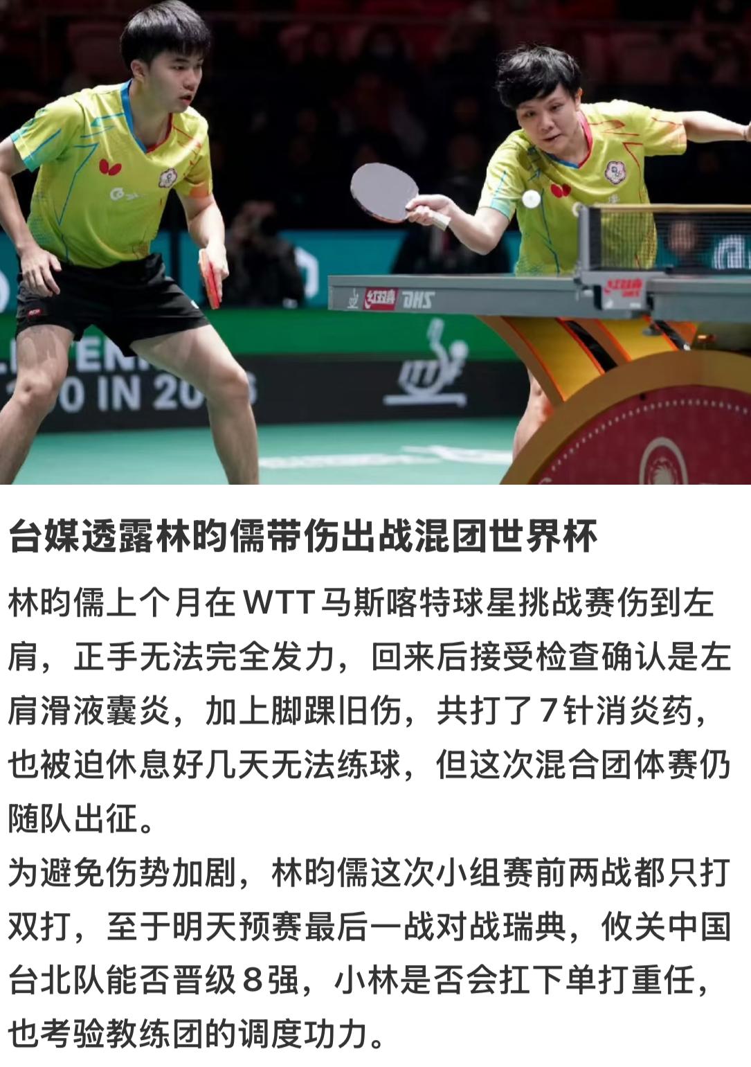 成都混团世界杯中国台北VS瑞典的生死之战 对战表出炉 林昀儒打混双 12月2日,成都混团小组赛 最后一轮, 中国台北VS瑞典队 第一盘 林昀儒/郑怡静VS卡尔森/卡尔伯格 第二盘 黄禹乔VS琳达 第三盘 林彦均VS安东卡尔伯格 林昀儒带伤只能打双打, 看来教练经过了深思熟虑, 混团没希望出线, 也不能让林昀儒硬拼! 这样的排兵布阵, 就可能直接回家了!