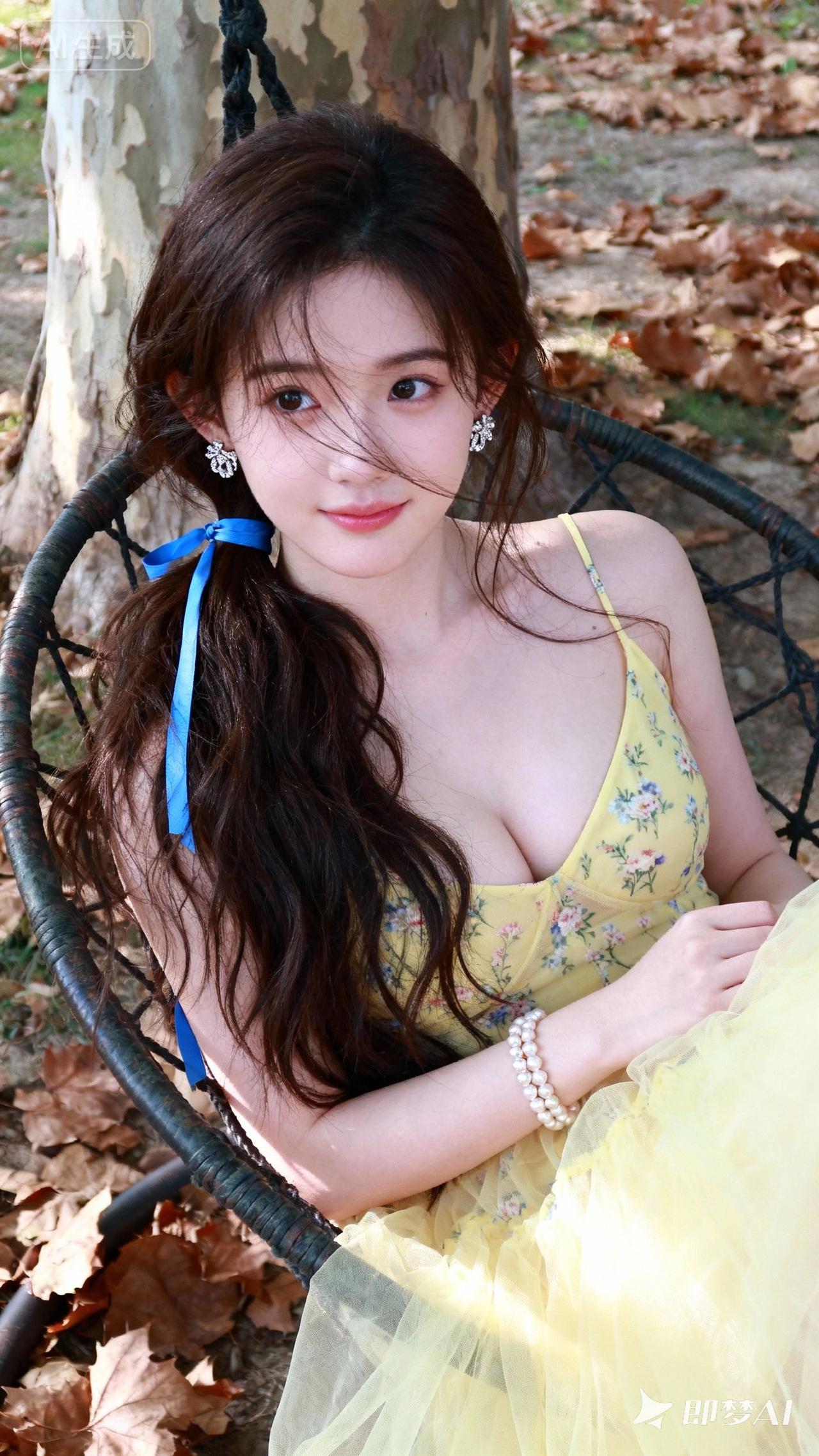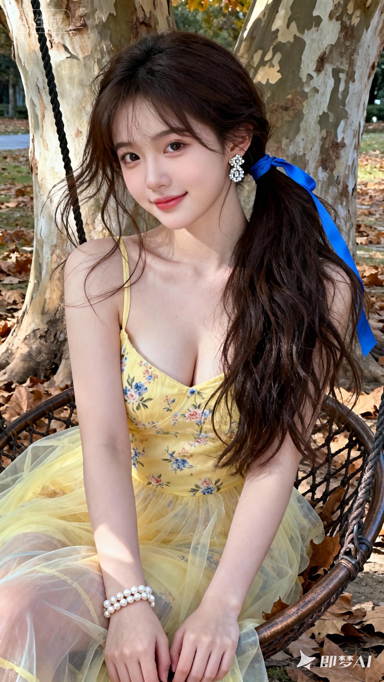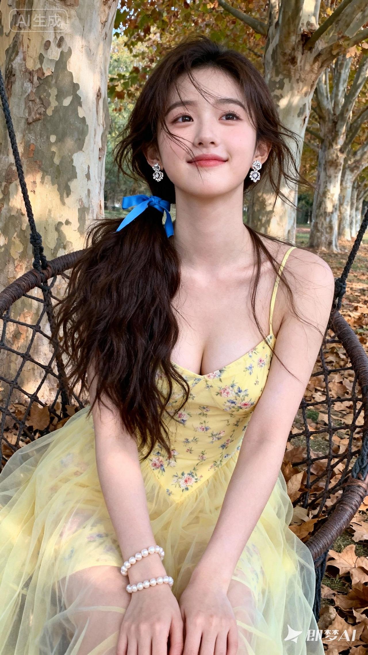 秋日暖阳下,少女轻摇秋千,蓝丝带飘逸,黄裙花影摇曳。