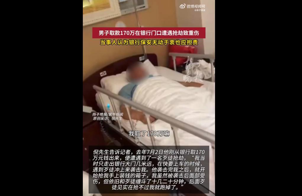 2024 年 7 月,倪先生在农行中牟白沙支行取现 170 万后,于网点西侧 25 米处遭歹徒抢劫,搏斗中被打失明,歹徒当日被抓并被判死缓。 倪先生认为银行应担责,银行称因视线被挡未及时发现,6 分钟后报警救助。 律师指出,需判断银行门口是否属经营范围及工作人员是否失职,银保监局已介入协调。 百万现金取现后遭劫致失明,这起事件暴露出银行安全保障的短板。 从法律层面看,银行对经营场所及周边有安全保障义务,门口区域通常属可控范围,且大额取现本就存在高风险,银行未提供必要护送,已显失职。 倪先生称搏斗 20 分钟银行未及时反应,与银行所述 “视线被挡” 存在争议,但安保视野盲区、应急处置滞后是不争事实。 网友吐槽保安 “只管排队收费”,折射出公众对银行安保履职的质疑。 事后慰问与整改承诺远不及事前防范重要,银行不能将安全保障止于门内。 此案的核心不仅是责任判定,更关乎金融机构安全义务的边界与落地。 希望通过司法审理明确责任,倒逼银行完善大额取现安保机制,把安全保障从 “事后补救” 推向 “事前预防”,真正守护储户的人身财产安全。