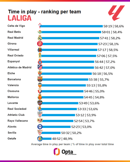 虎扑12月02日讯Opta数据统计,盘点本赛季至今西甲各队场均净比赛时间: