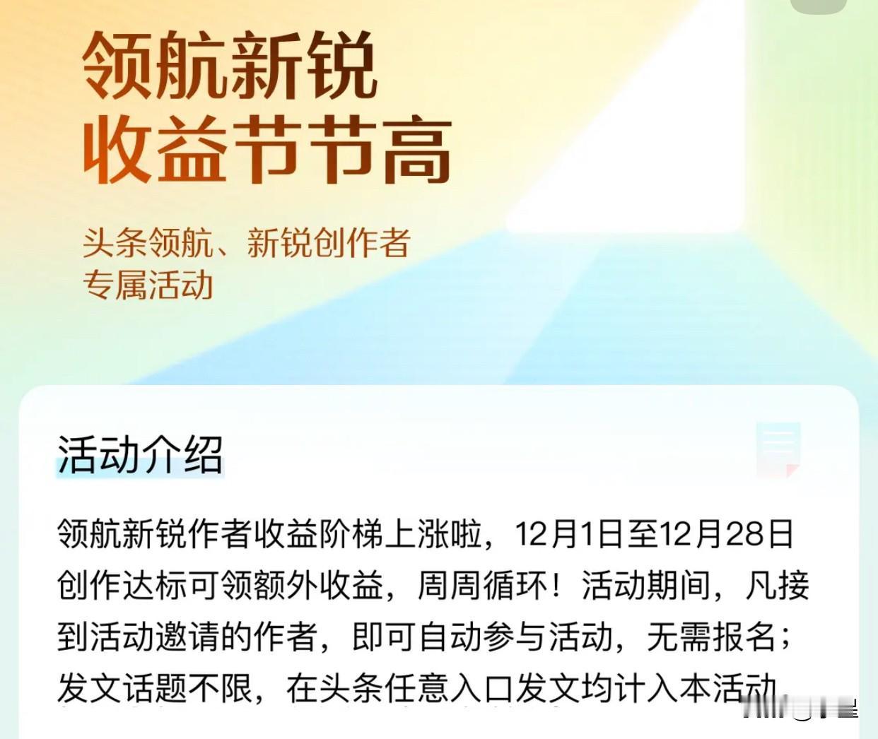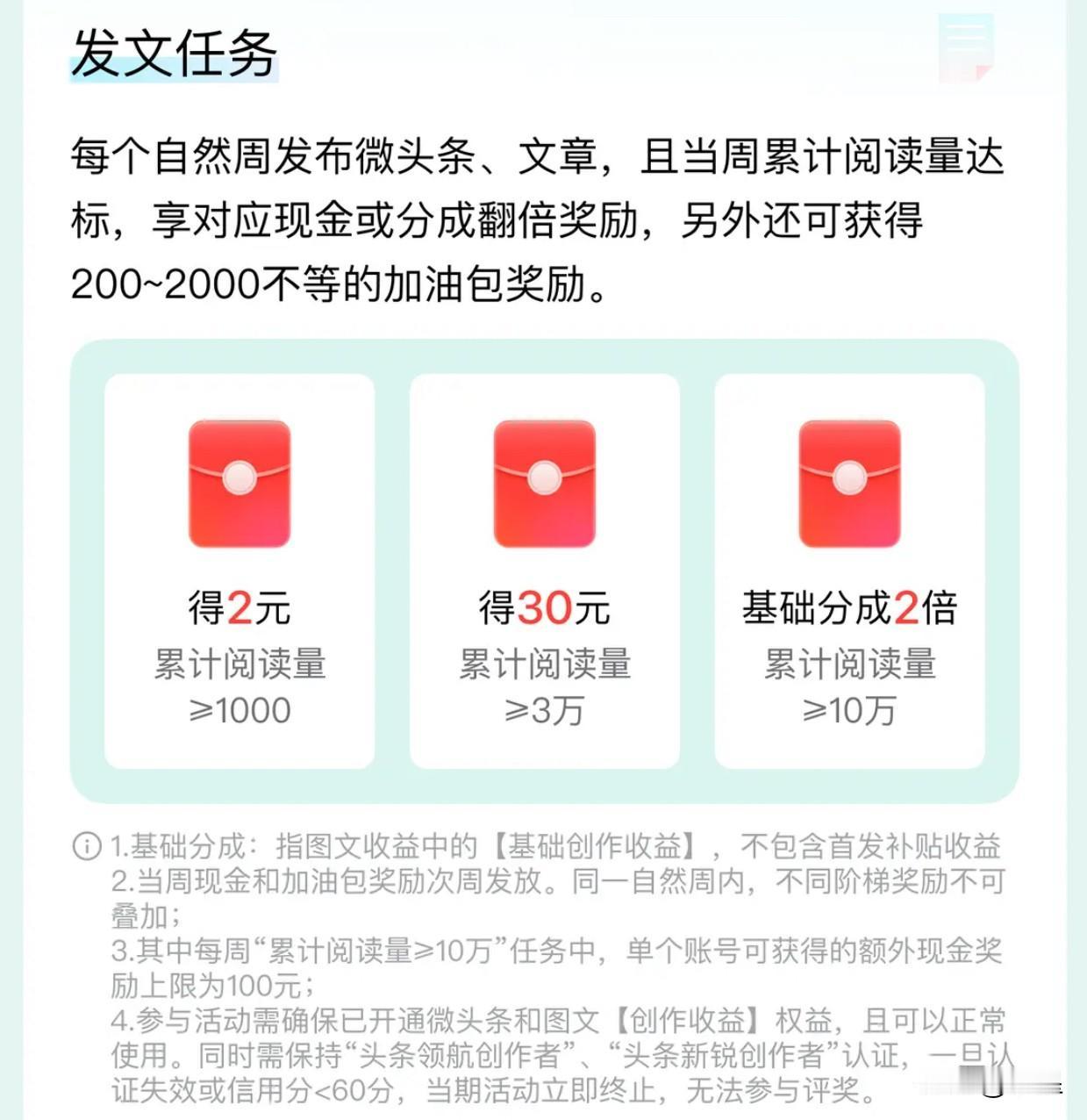 终于也让我接到一次官方活动[耶] 认证新锐后收益直线下降 看到好多创作者说他们取消了 新锐作者的标签 本来正在犹豫要不要取消 就收到了涨收益的活动邀请 前两条奖励看着似乎不多 但第三项就厉害了 阅读量达到10万+的 基础收益翻倍 也就是阅读量越好 翻倍拿到的就更多 燃起来吧条友们 本周争取来几条10万+[耶]