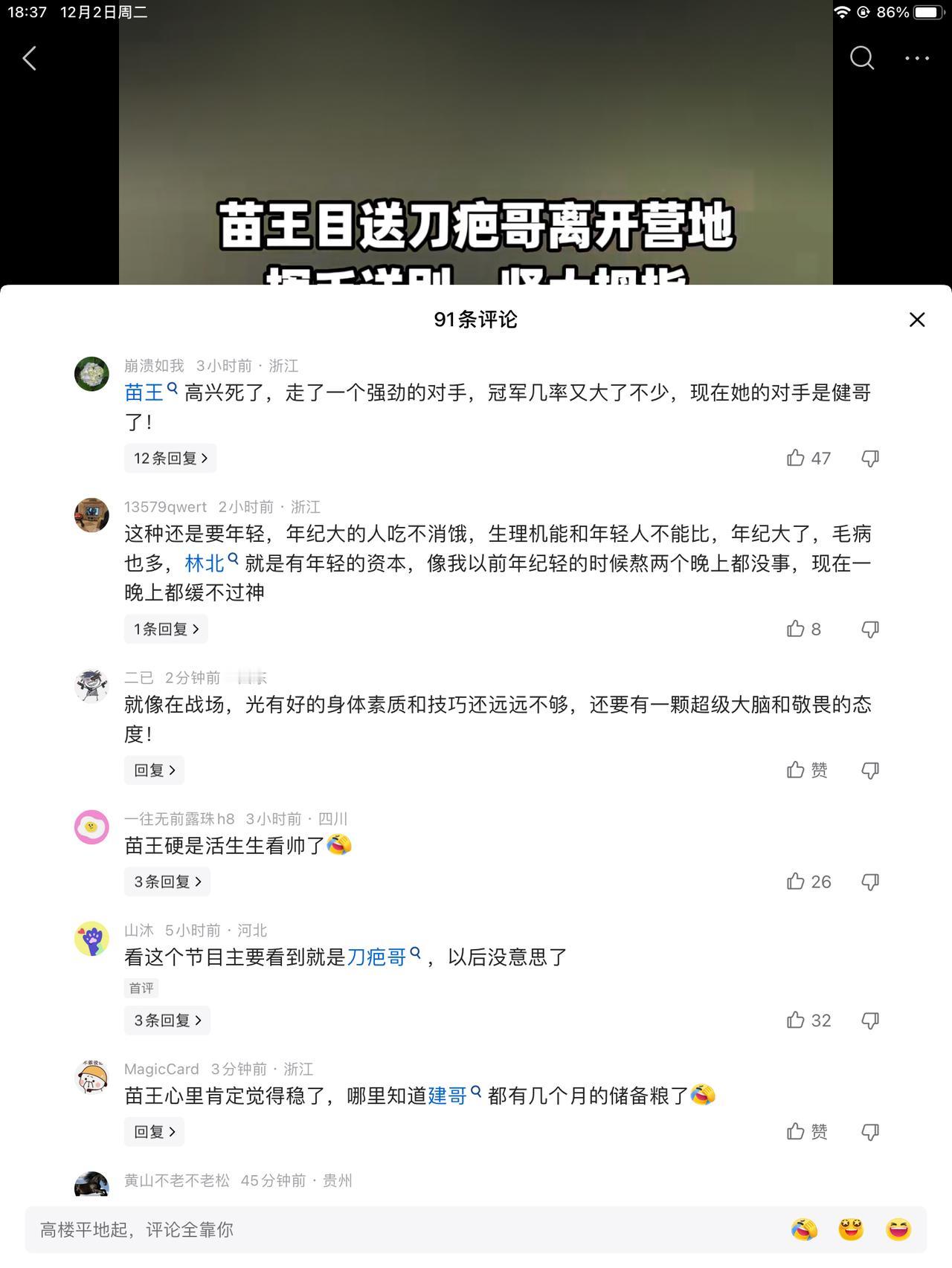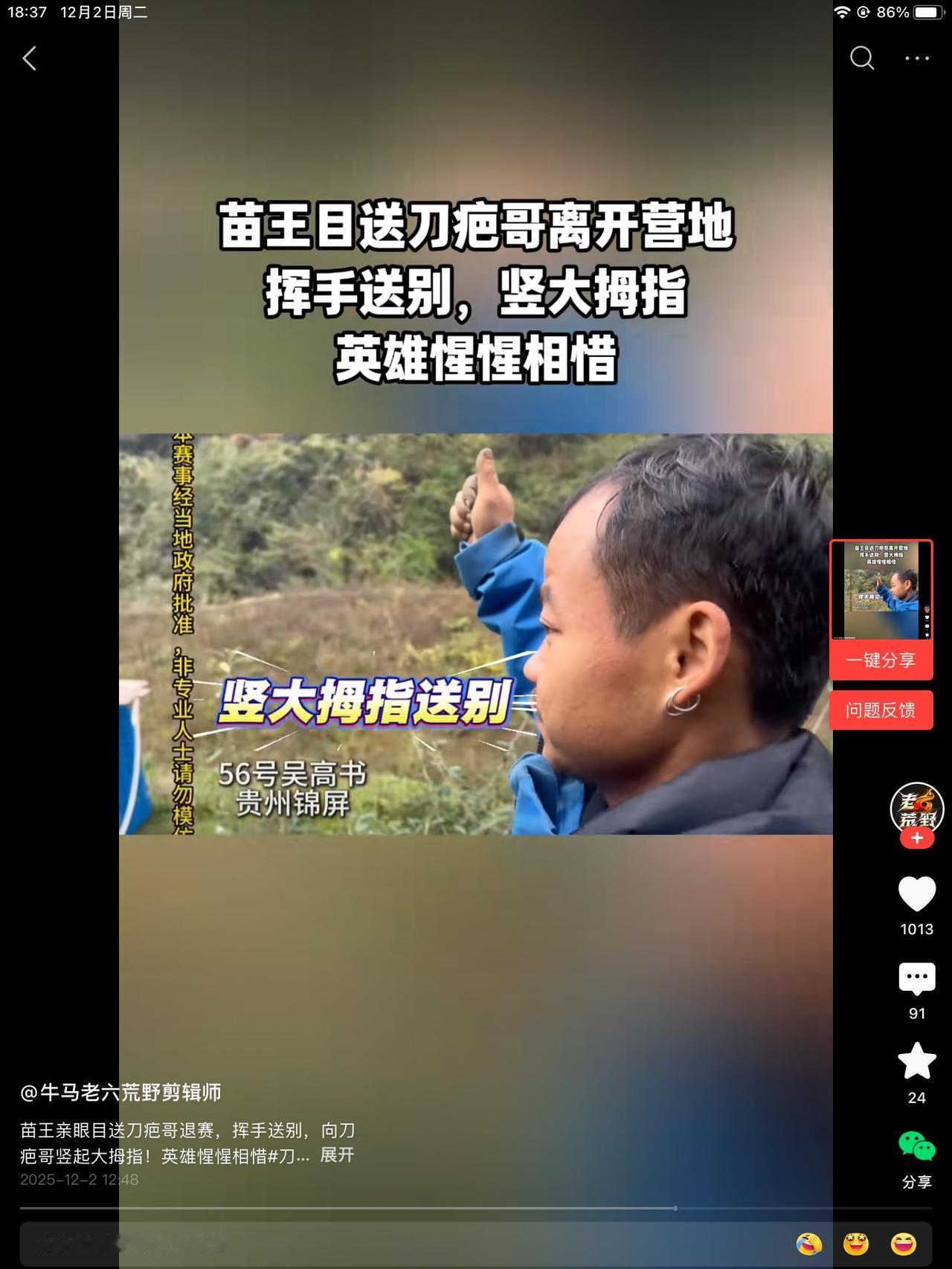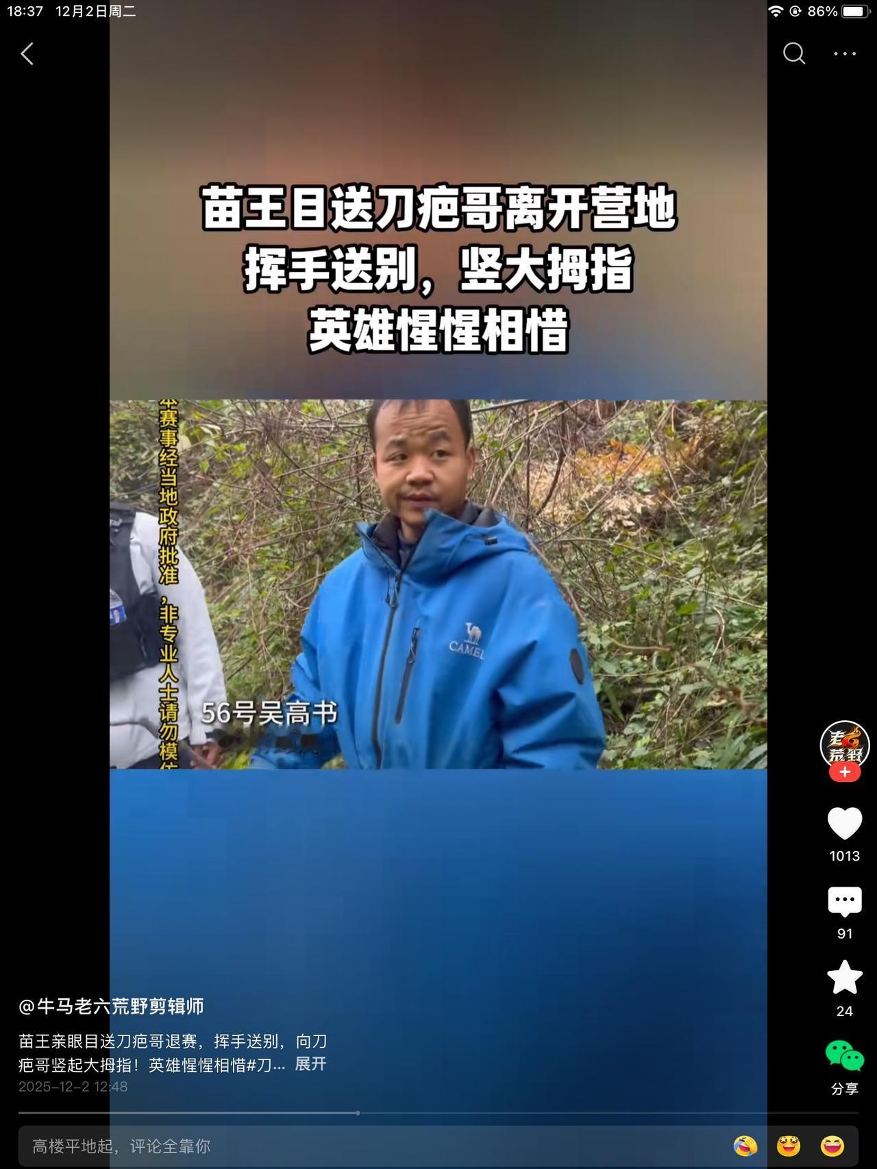 苗王目送刀疤哥离开的镜头,真把人看的很心酸。硬生生把苗王看帅了。天王盖地虎,苗王一米八五! 苗王竖起大拇指,送别刀疤哥。他没想到,刀疤哥能这么早退赛。有选手退赛,苗王应该很高兴的,没想到,他竟是这样的表现。很难得,惺惺相惜。在场上,既是对手,也是战友。 苗王除了不舍,他也不知道场上其他选手的状况。建哥的储备粮,都能过年了。文车车,心率只有五十,有点低了。这欧巴没有糖,只有盐,身体没力气。估计下一个就他了。 那个吃半夏中毒的,刚能挤出几个字,还是挺难好的,在没有药的情况下。林北还是那个傻猴子。不知是年轻还是有猫腻,总之,他状态一直很好。我更相信,他是年轻,身体好。