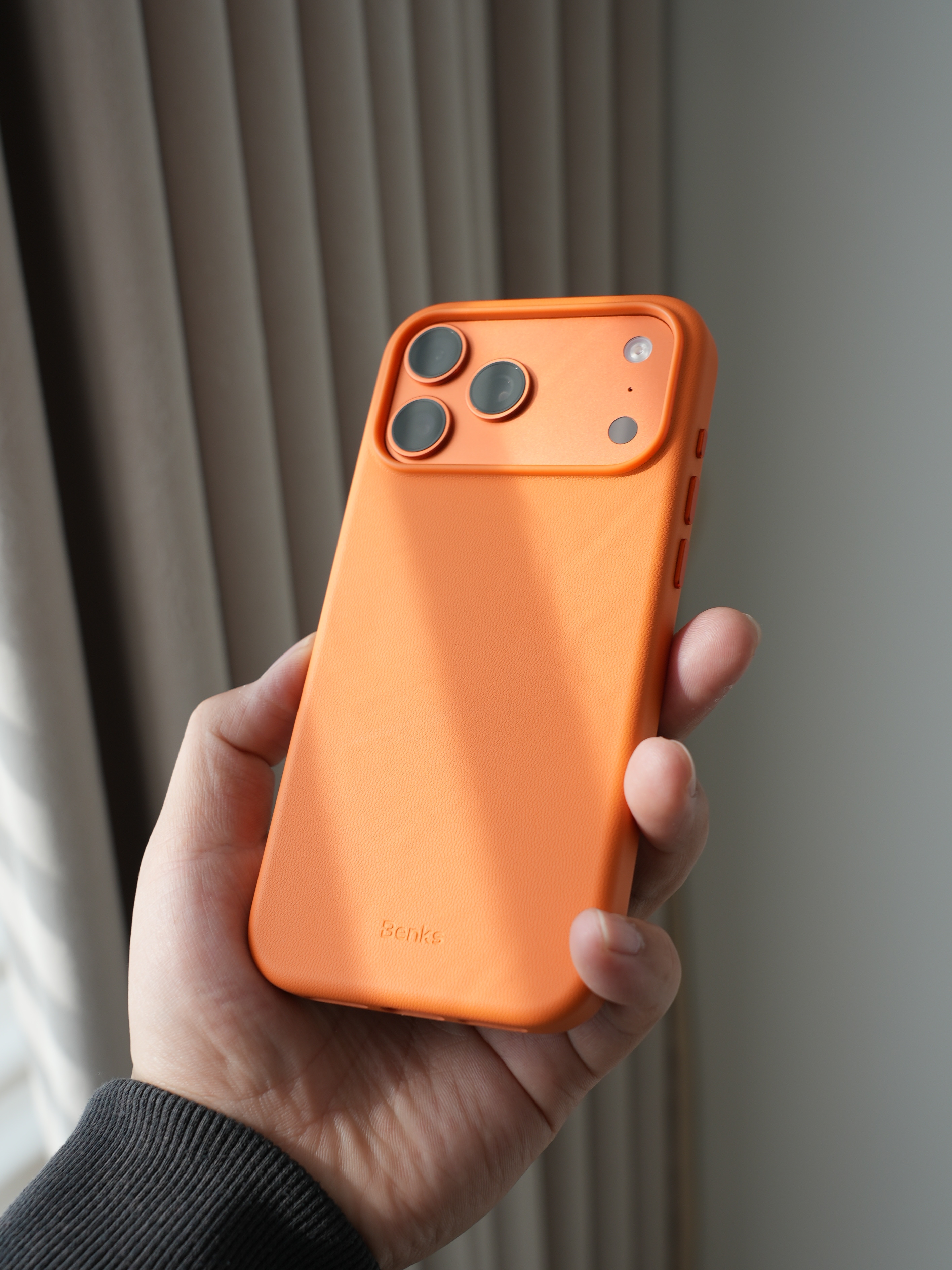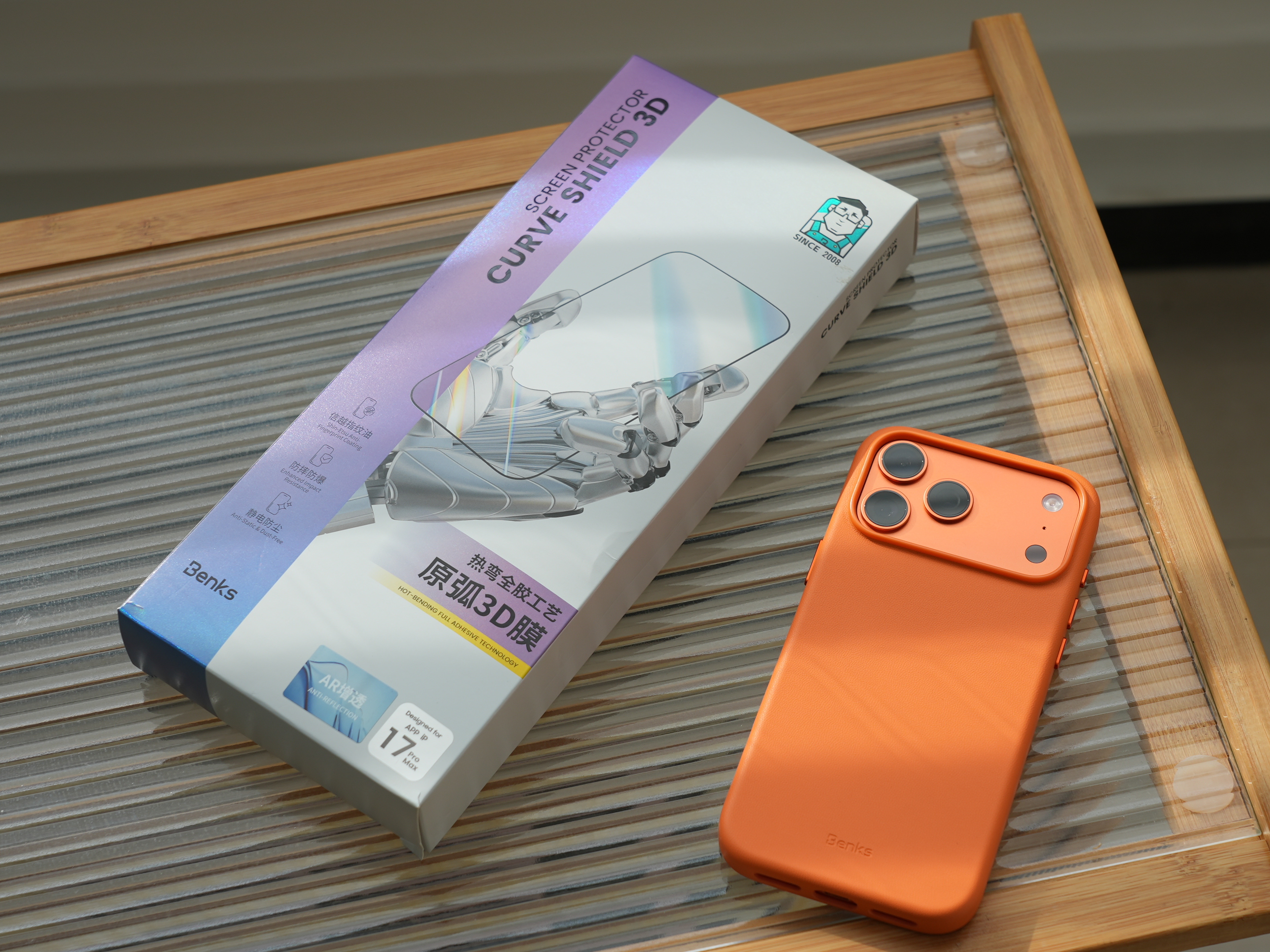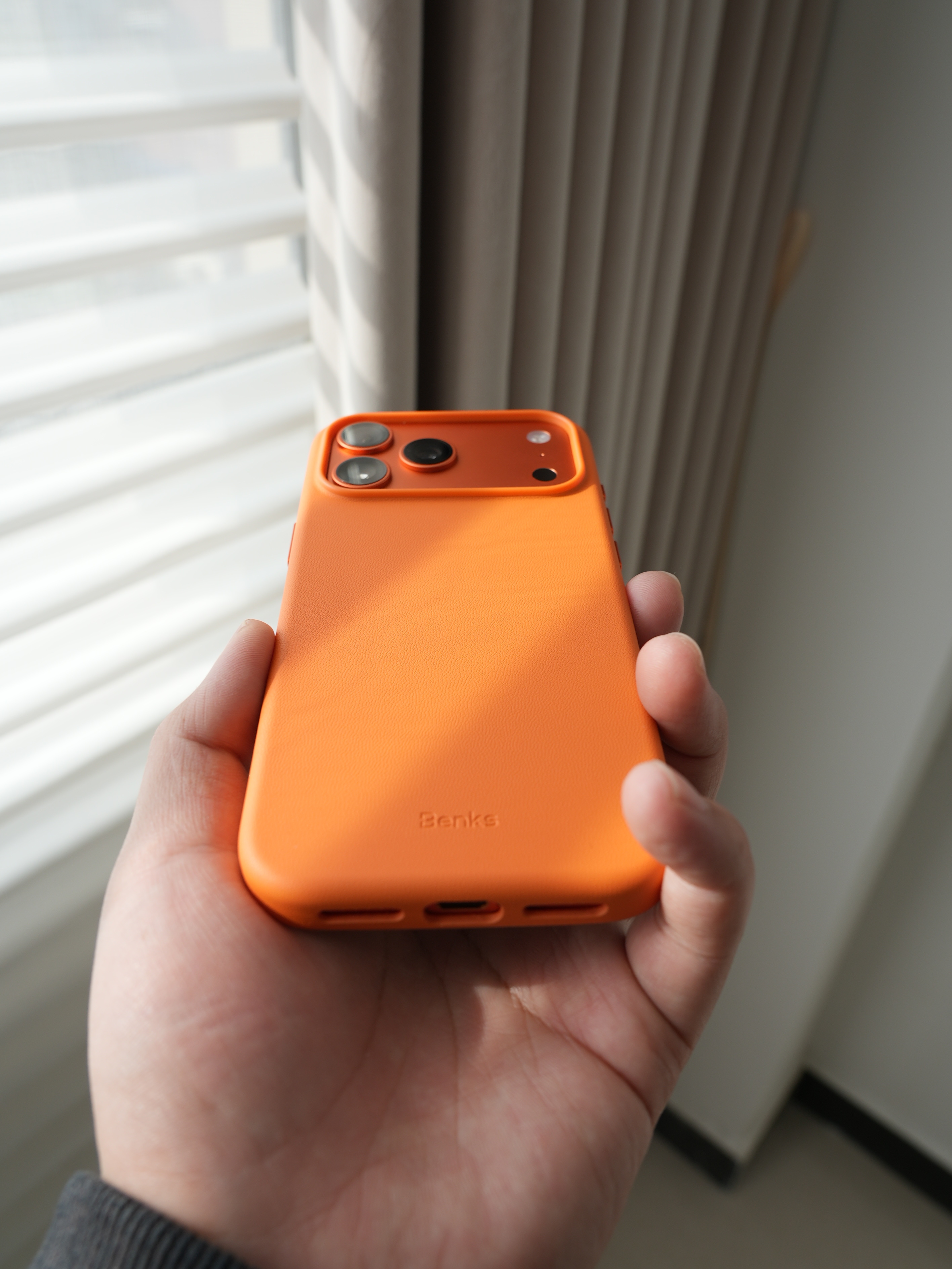 也算是终于找到一款,很适合今年iPhone 17 Pro Max的壳膜,橙色确实太难配壳膜了,Benks这款很不错,全包且手感很舒服,相机按键也有。今年iPhone不买care+就老老实实带全包壳吧,边框太软了,一磕一个坑。