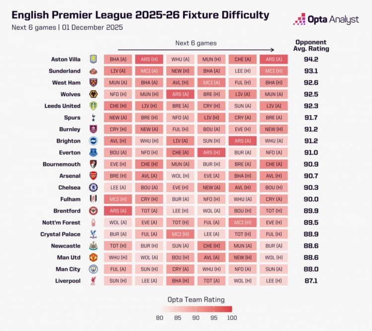 直播吧12月2日讯opta分析了英超各队未来6轮的赛程难易程度,维拉赛程最为艰难,利物浦最容易。曼城第二容易,曼联并列第三容易。