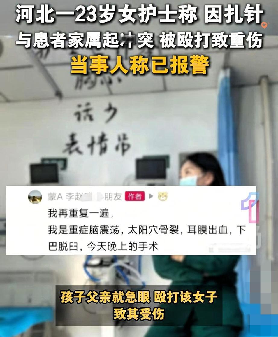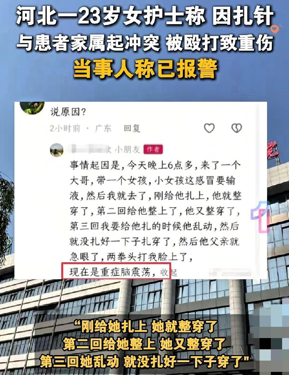 两拳砸向护士的瞬间,疼的不只是一张脸 真的越看越气! 秦皇岛那位23岁护士的遭遇,简直戳中了所有人的痛处—— 明明是小女孩输液时反复乱动导致扎针不顺,她全程小心翼翼尽力补救,换来的却是患者父亲两记重拳,直接被打得重度脑震荡、太阳穴骨裂,脸上缝了十几针还得手术。 没人否认家长心疼孩子的心情,但疼孩子不是施暴的理由。 儿童血管细、怕疼乱动本就是输液常态,护士没做错任何事,凭什么要为孩子的不配合买单? 更讽刺的是,护士加班到傍晚还在连轴转,满心盼着患者康复,却栽在自己守护的人手里。 护医新规早明确零容忍医闹,施暴者被拘留4个月远远不够,这种伤害对护士来说是身心双重重创。 别让善良的从业者寒了心,尊重医护从来不是口号,而是藏在克制的情绪里、理性的沟通中。 你觉得该如何真正守住医护人员的执业安全?