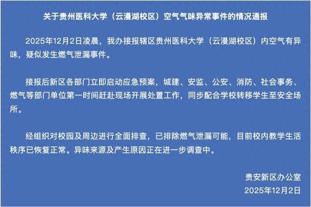 通报称,12月2日凌晨,贵安新区办公室接报辖区贵州医科大学(云漫湖校区)内空气有异味,疑似发生燃气泄漏事件。