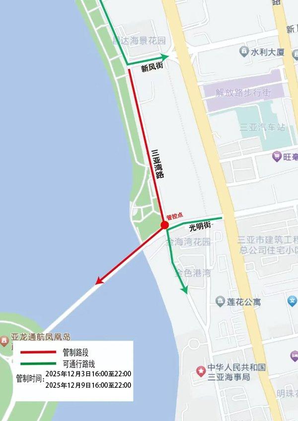 第七届海南岛国际电影节开幕式和闭幕式活动将于2025年12月3日和12月9日在三亚市凤凰岛举行。为确保开、闭幕式活动举办期间道路交通安全有序,根据《中华人民共和国道路交通安全法》有关规定,将在活动期间对三亚湾路(新风街路口至光明街路口)路段实行道路交通临时管制,现将有关事项通告如下: