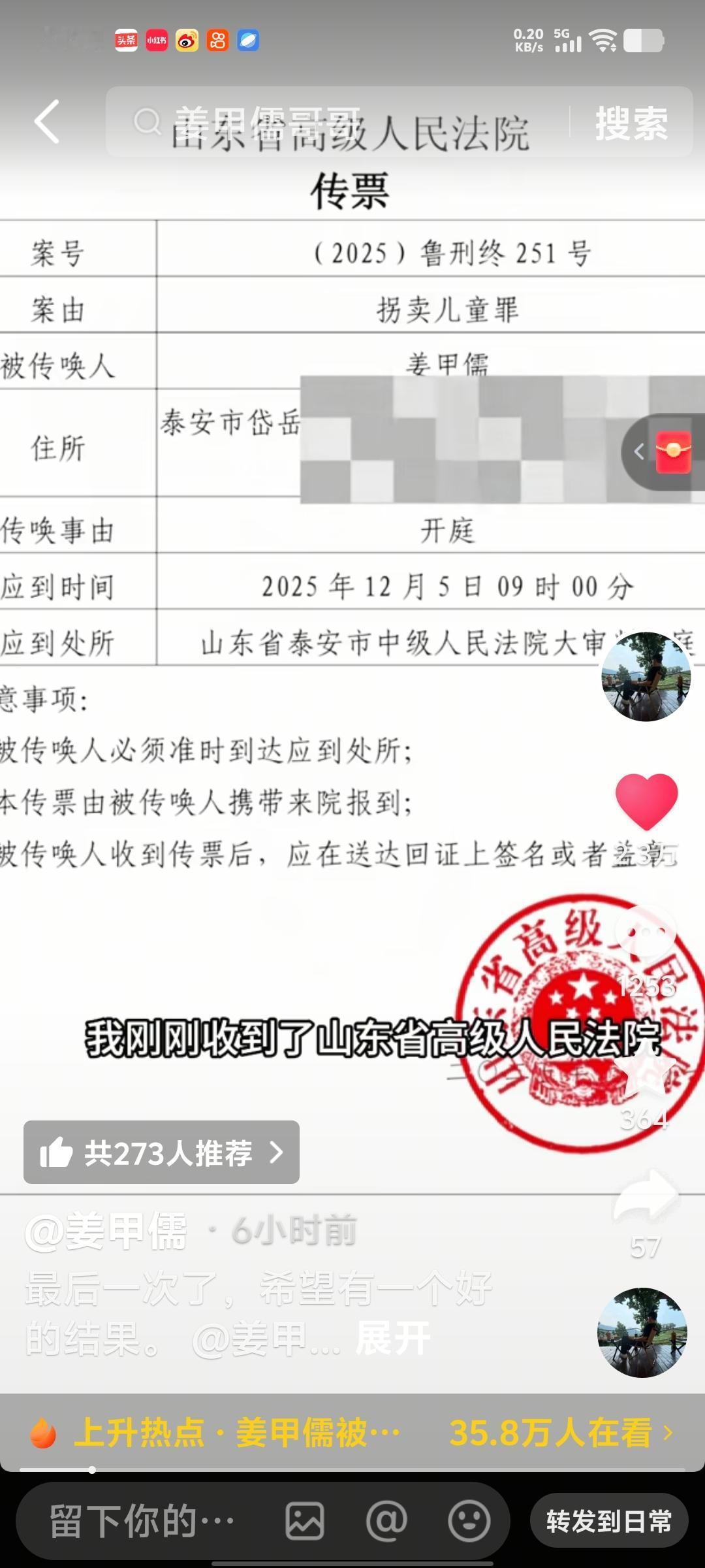 人贩子上诉!姜甲儒收12月5号泰安开庭传票,焦虑最后庭审结果,姜妈妈怕报复,律师安慰让全家重拾信心~ 姜甲儒发视频。说自己收到法院传票了。12月5号开庭。因为人贩子上诉。 可能有什么所谓的新证据?他的心情还是比较紧张和焦虑的。因为这也是最后一次庭审了。他说希望有更好的结果。 姜妈妈说。害怕这些人。被减刑出来之后报复自己,报复社会。 他比较疑虑的是收到高院的传票,觉得应该在济南开庭,现在又变成泰安开庭, 接着他就给李律师打电话。李律师说。这是为了方便押送。要对这个案子有信心。 听李律师的安慰。甲儒一家有信心了,人贩子肯定未得到严惩。 而且这件事现在已经登上热搜,有全国人民都在监督审判的结果。所以人贩子绝对不会减刑的。