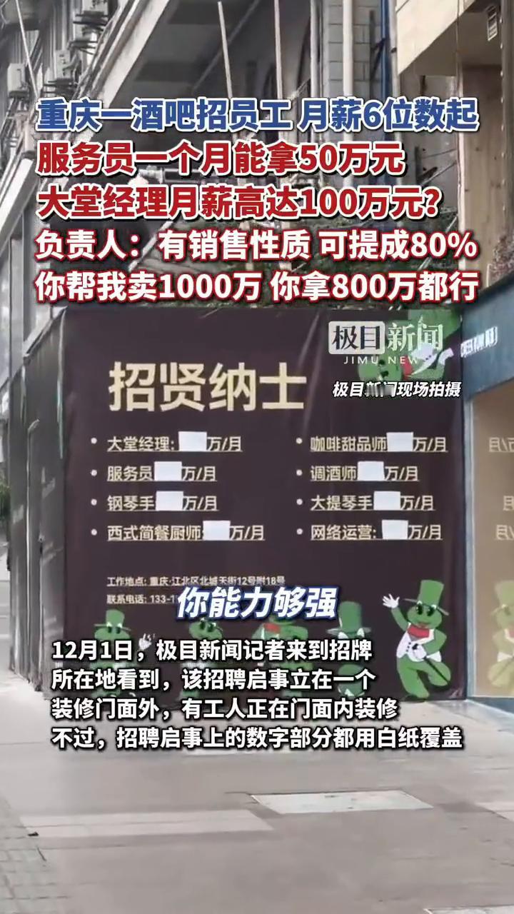 重庆一酒吧招员工月薪6位数起,服务员一个月能拿50万元,大堂经理月薪高达100万元?负责人:有销售性质可提成80%。 11月30日,有网友发贴称,重庆市观音桥商圈北城天街一酒吧店招聘大堂经理、服务员等多个岗位,月薪最低为50万元,最高可达100万元。 负责人:真的销售,一个噱头而已。 12月1日,极目新闻记者来到招牌所在地看到,该招聘启事立在一个装修门面外,有工人正在门面内装修。不过,招聘启事上的数字部分都用白纸覆盖。 酒吧负责人称薪资属实,该店是重庆工"30年连锁品牌,客源较多,这些岗位带有销售性质,"如果你销售够厉害,卖一百万可以提成80%"。 该负责人称,在数字处贴上白纸是因为此事引发关注后,有关部门让他们贴上白纸覆盖的,其强调能力强可拿到高薪。 工作地点:重庆:江北区北城大街12号附18号。