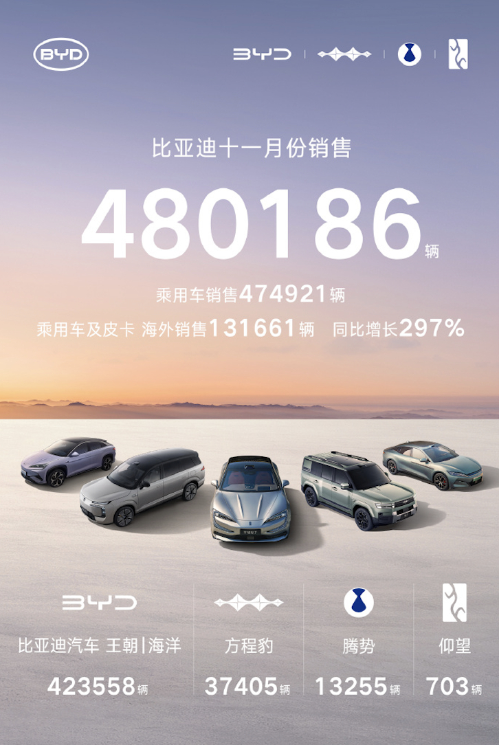2025年11月,比亚迪销售480186辆,创下年内单月销量新高。不过与去年同期
