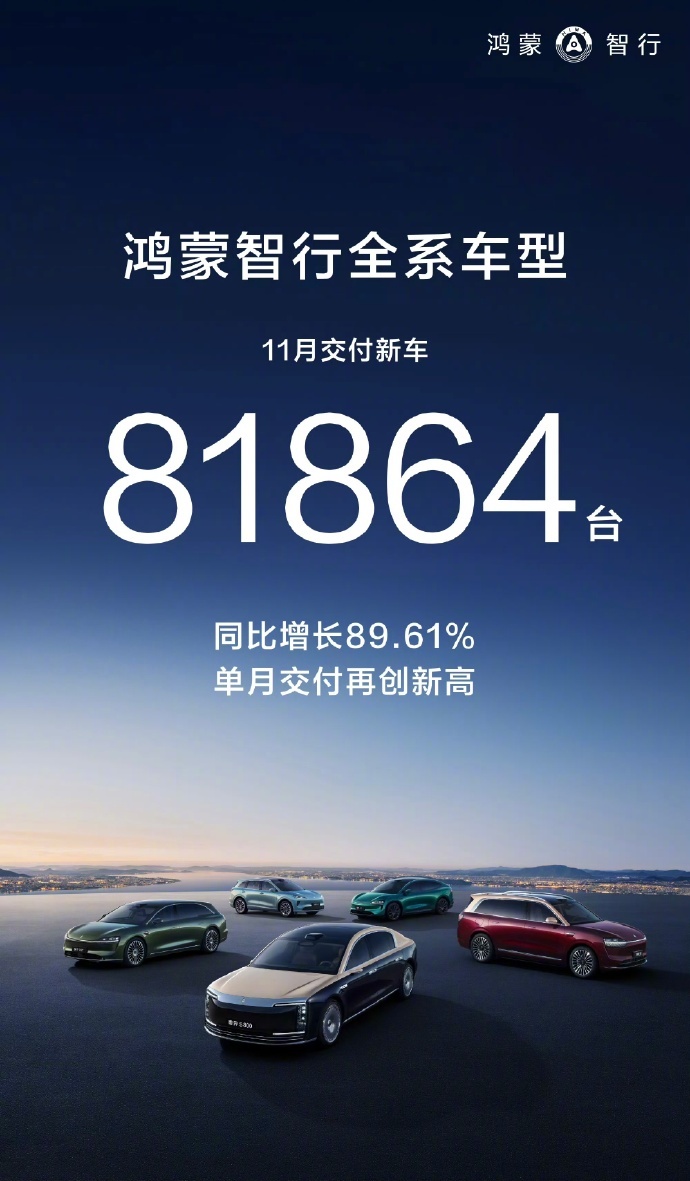 鸿蒙智行好猛,11月销量8.18万台,稳居第一。问界5.16万台;智界1.17万