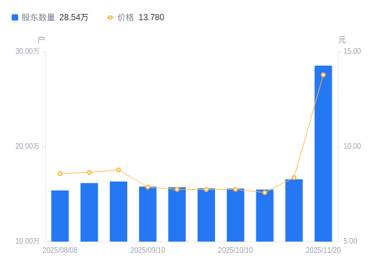 日期A股户数(户)流通A股户均持股数(股)户均持股市值(万元)2025-11-202853625566.097.672025-10-311655909592.078.032025-10-2015485810256.827.772025-10-1015592510186.637.892025-09-3015602310180.237.882025-09-1915725110100.747.832025-09-1015793510056.997.912025-08-291633169725.638.542025-08-201616369826.718.492025-08-0815388310321.818.86
