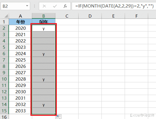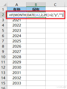 DATE(A2,2,29):用 date 函数将 A2 单元格中的年份与 2 月 29 日组合成一个日期,如果是闰年就返回该日期,不是闰年则返回 3 月 1 日的日期;