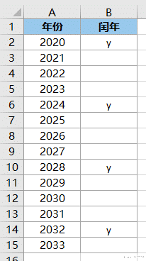 案例:判断下图 1 中 A 列的年份是否是闰年,效果如下图 2 所示。