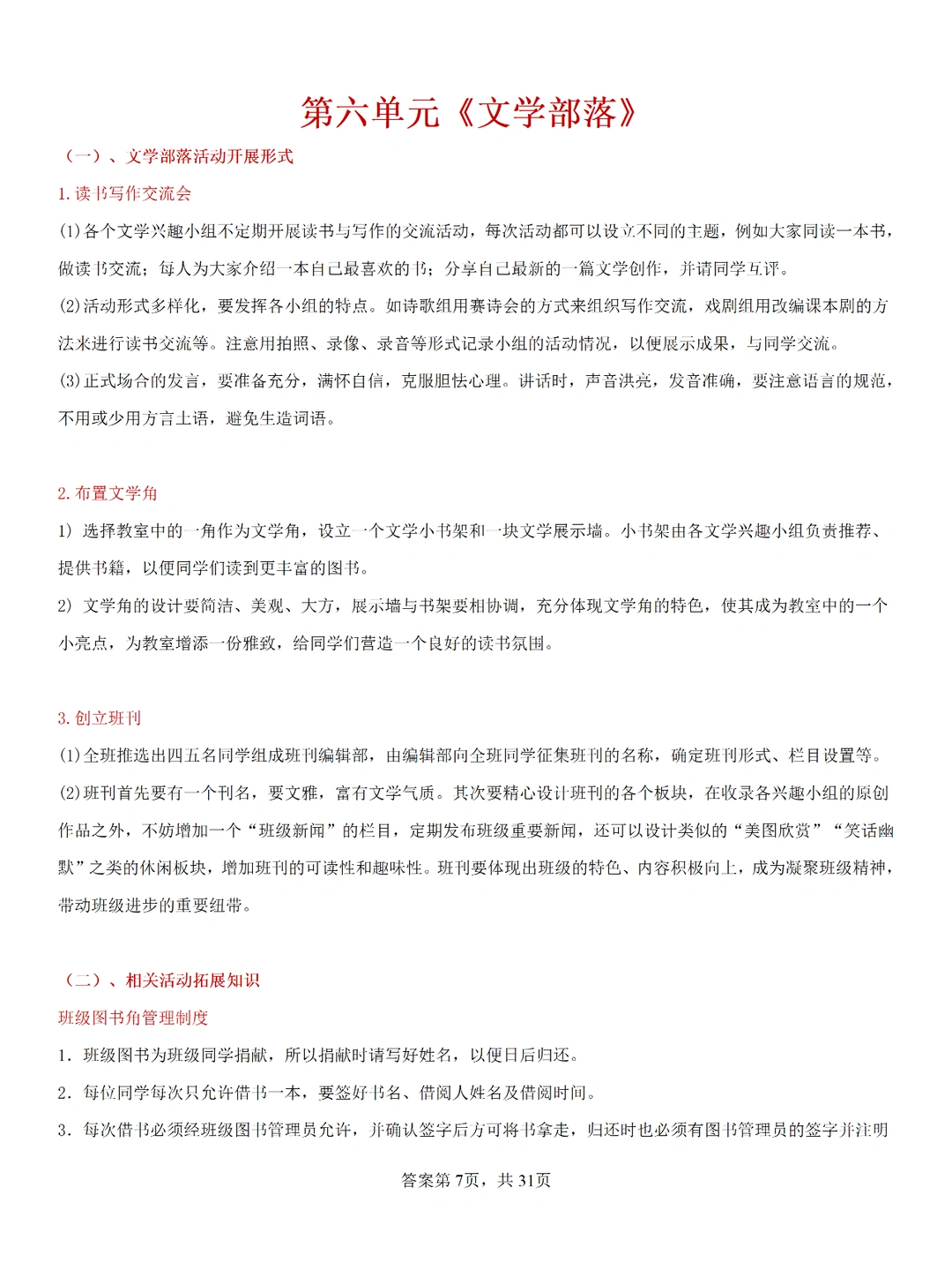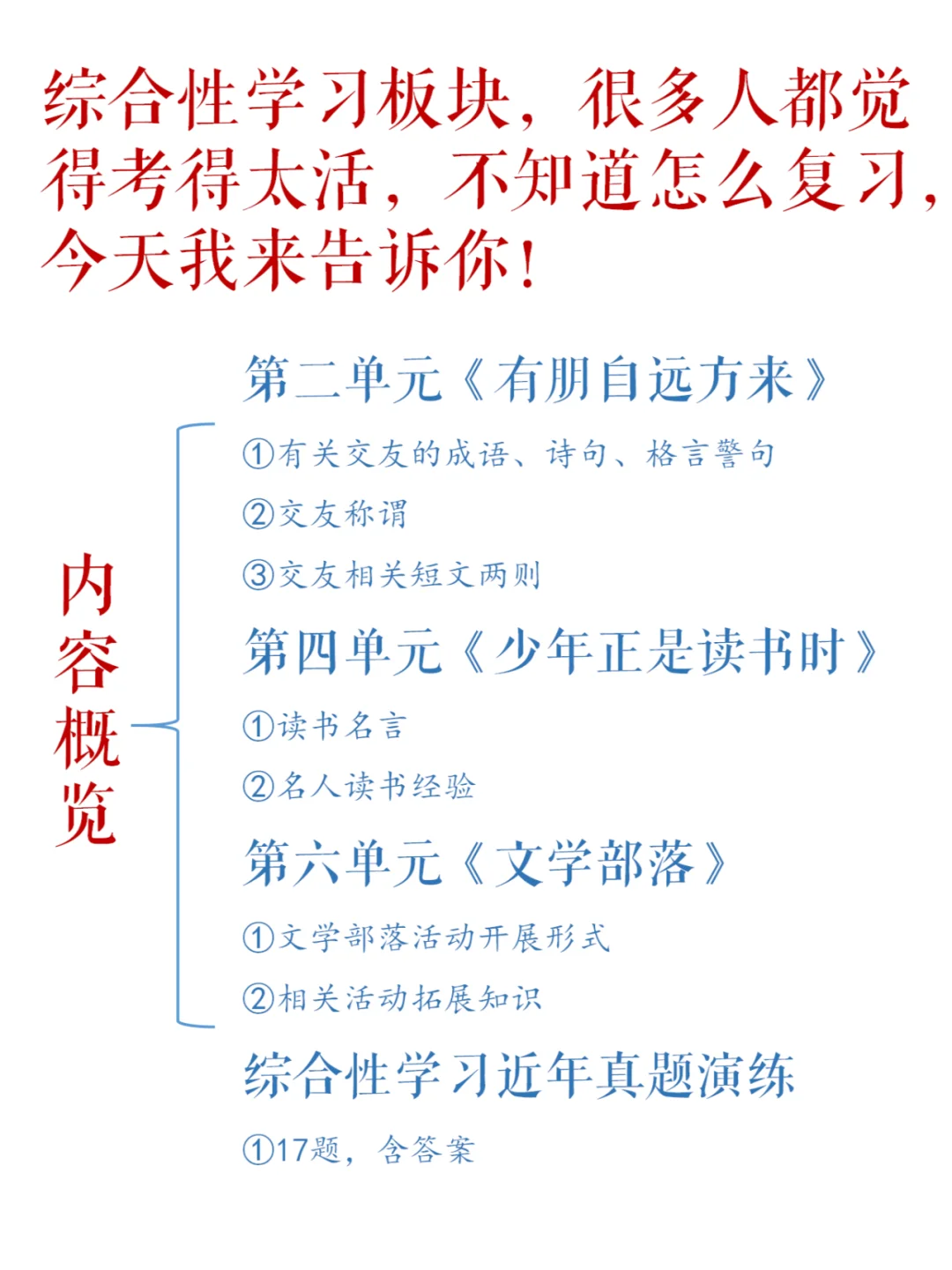 很多人觉得综合性学习太灵活,不知道怎么复习,不要怕! [斜眼R] 请记住,一切课外的东西都是“纸老虎”,只要你学好了课内,你就能发现,一切课外都是来源于课内。 [派对R] 假如我问你,如果你要你组建一个“文学兴趣小组”,组建完了问你可以举办什么活动? [自拍R] 如果你没有在3秒钟内反应过来这是来自于哪里,说明你对教材不熟悉,请翻看教材第130页。 [飞吻R] 所以,赶紧利用好这个笔记,抓紧复习起来吧!
