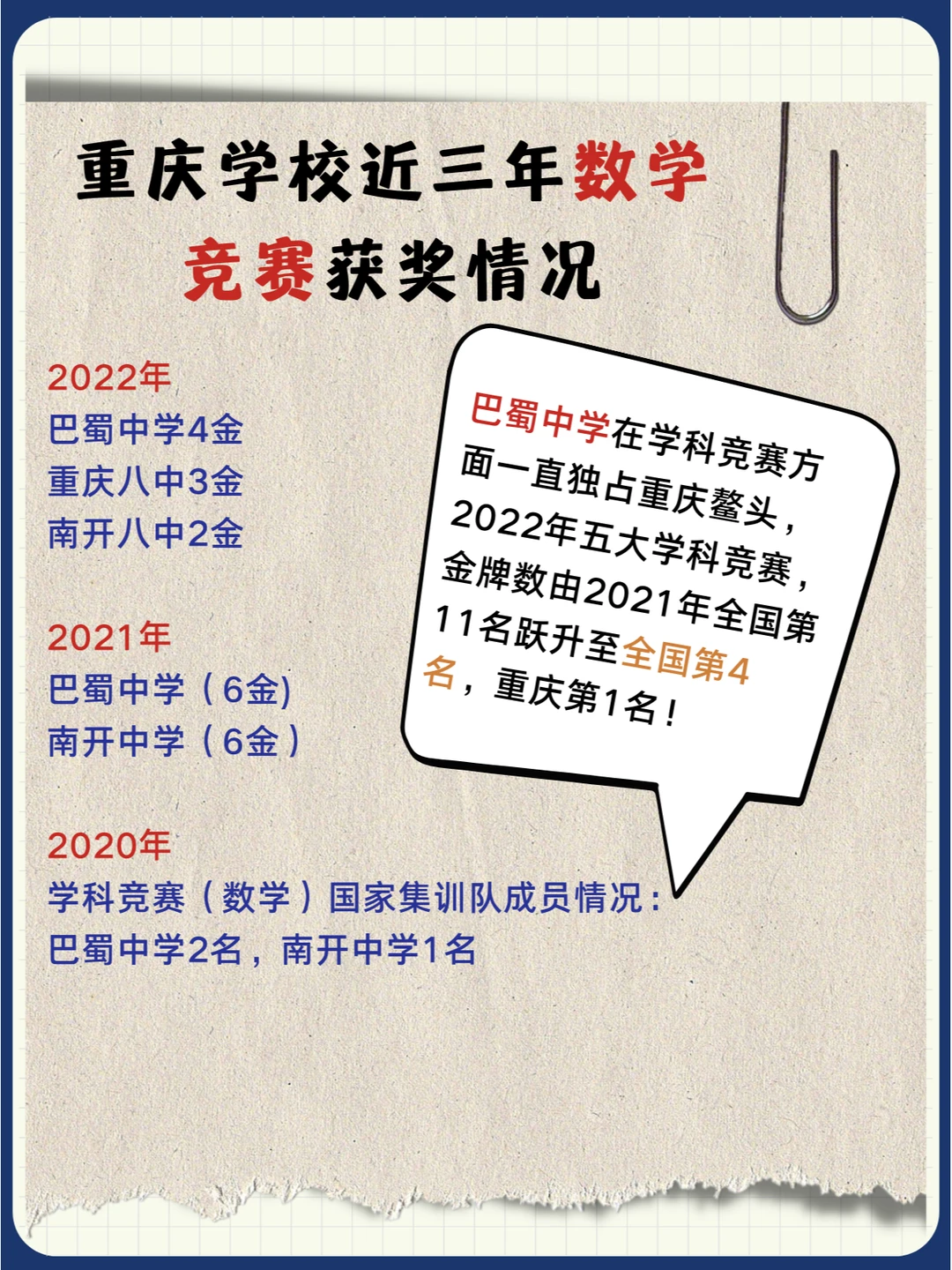 👉巴蜀中学2022年五大学科竞赛,金牌数由2021年全国第11名跃升至全国第4名,重庆第1名!重庆八中全国第30名,重庆第2名。