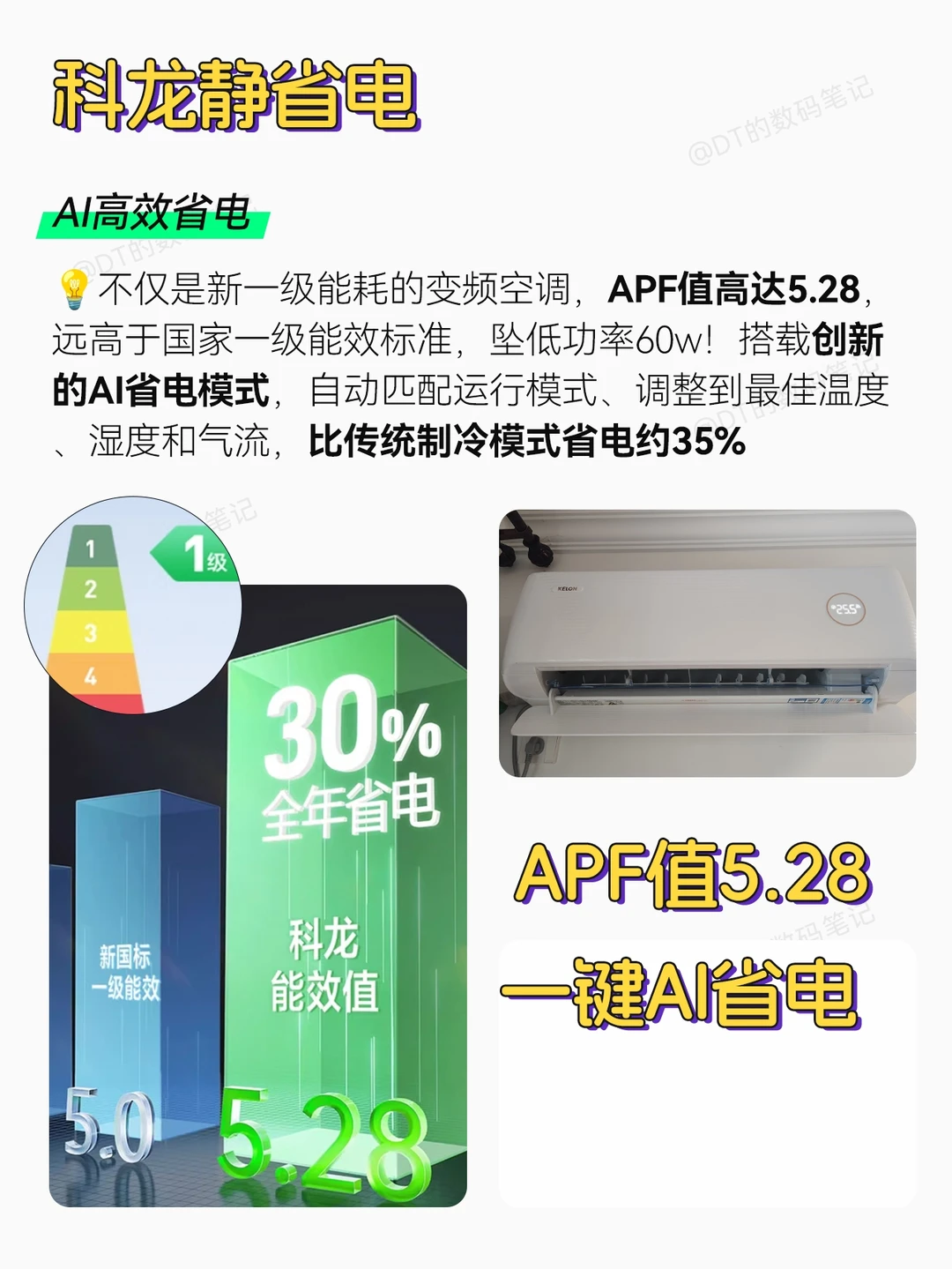 ✅这款空调真的超省电,他是新一级能耗的变频空调,APF值高达5.28,远高于国家一级能效标准,坠低功率60w!搭载创新的AI省电模式,自动匹配运行模式、调整到最佳温度、湿度和气流,比传统制冷模式省电约35%