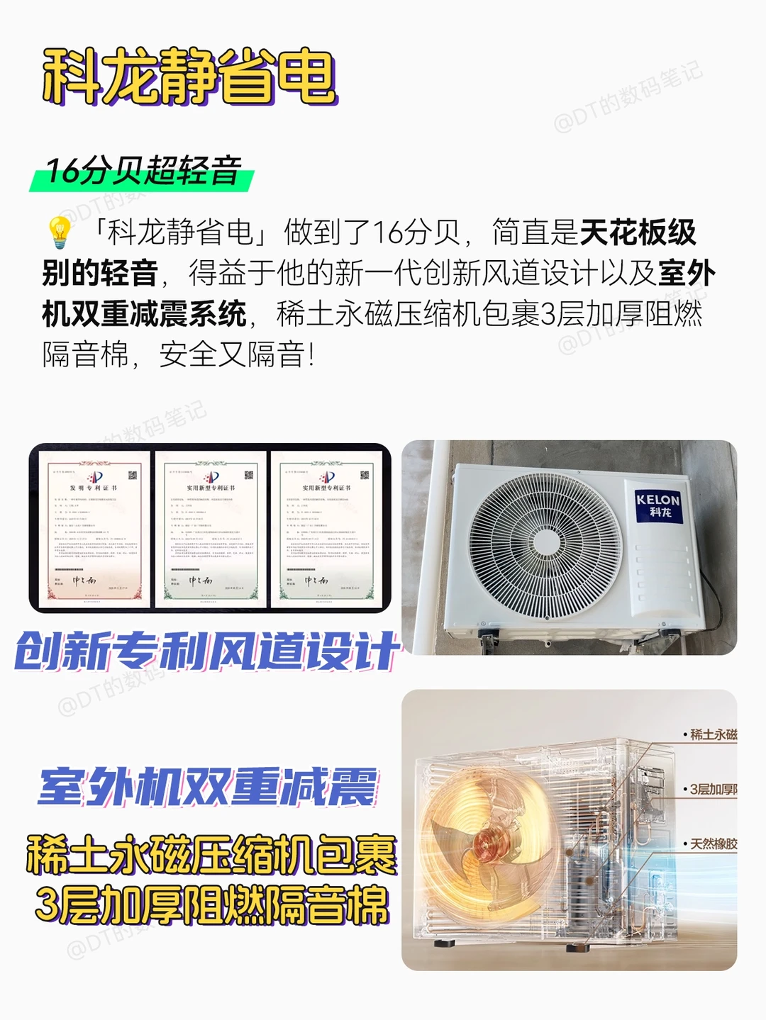 ✅通常40分贝以下,环境被认为是安静的,适合休息和睡眠!但「科龙静省电」做到了16分贝,简直是天花板级别的轻音,得益于他的新一代创新风道设计以及室外机双重减震系统,稀土永磁压缩机包裹3层加厚阻燃隔音棉,安全又隔音!