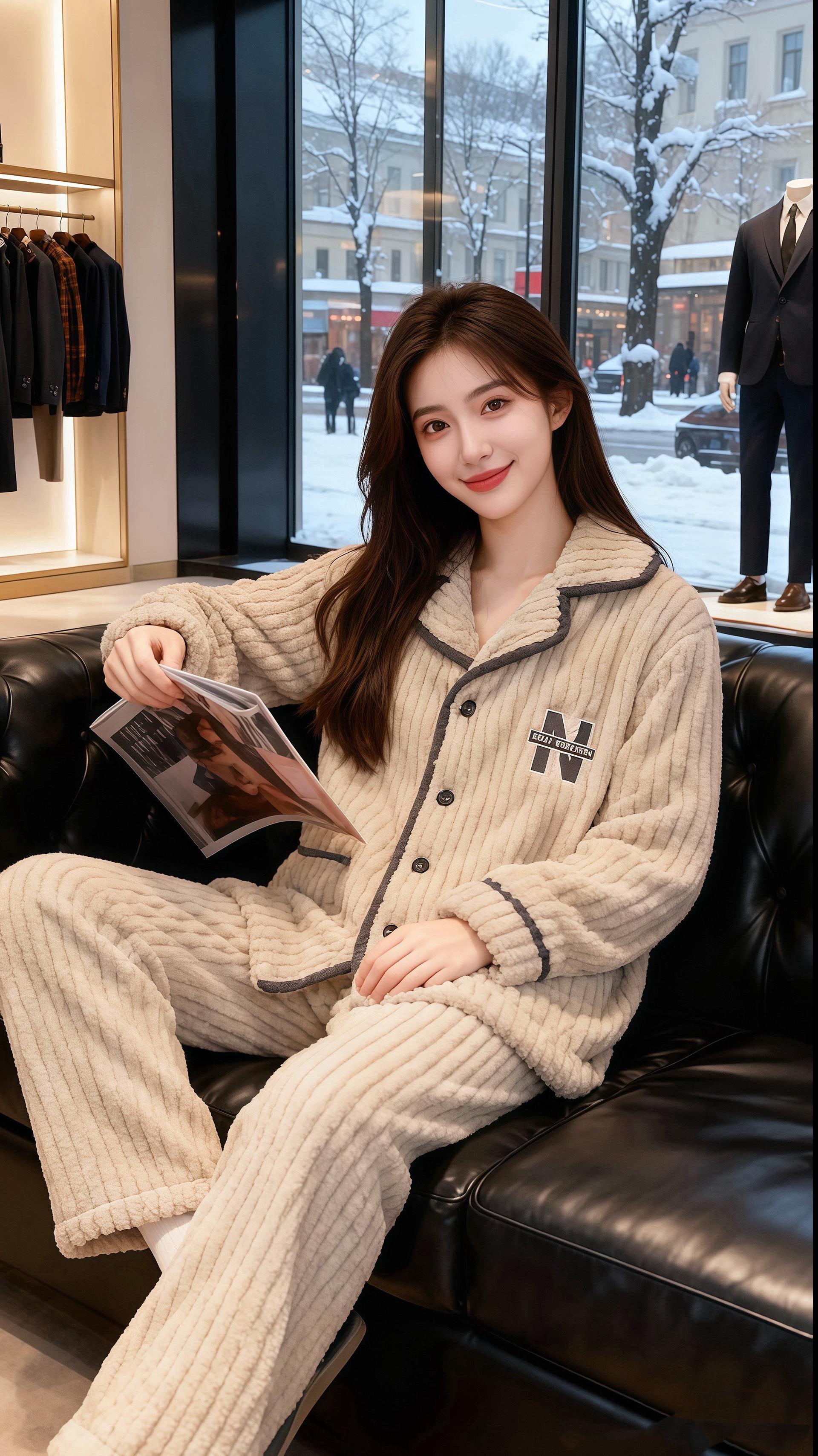 此刻她捧着热咖啡笑,睡衣下摆随着转身轻晃,裤线垂得慵懒又妥帖。窗外雪粒子敲玻璃,她指尖划过衣架上同款,侧脸漫着软光——原来“刚好”是这种模样:不厚不薄,颜色像他藏了一秋的卡布奇诺,连袖口那道灰边,都像他领带夹的暗纹。