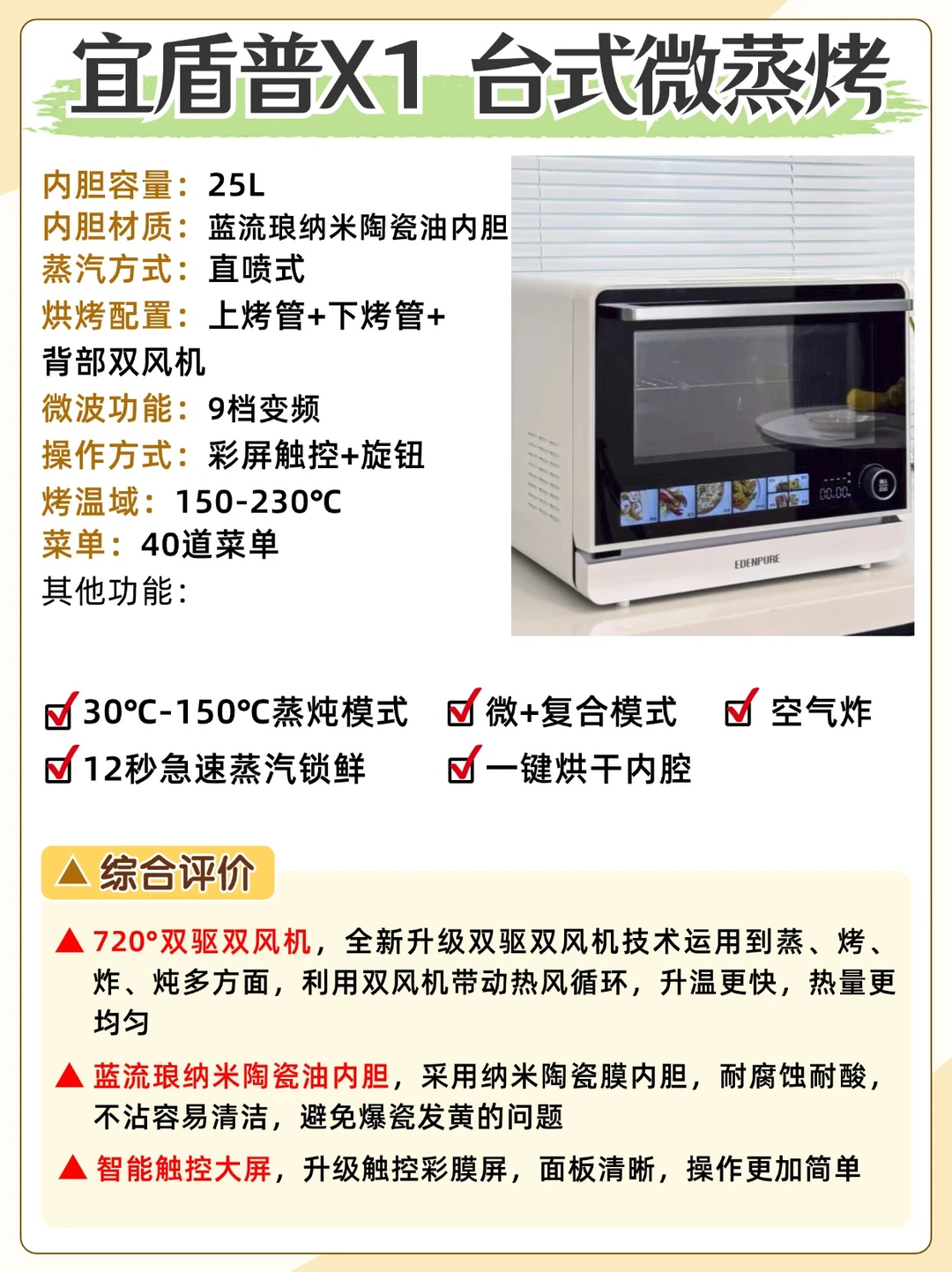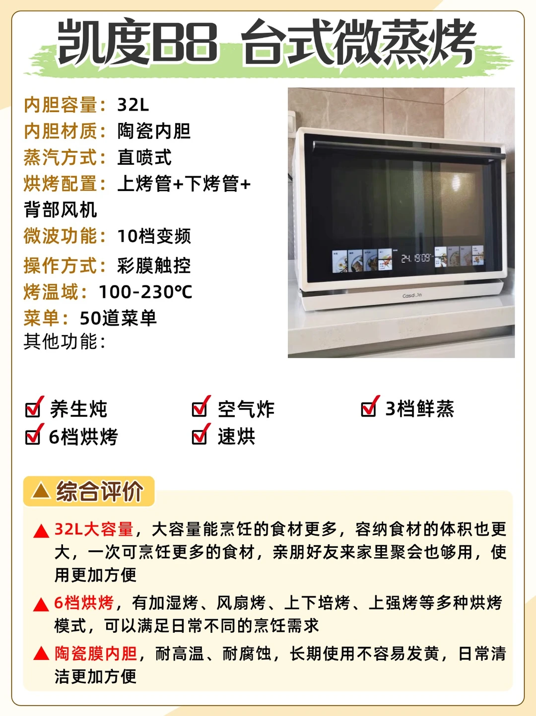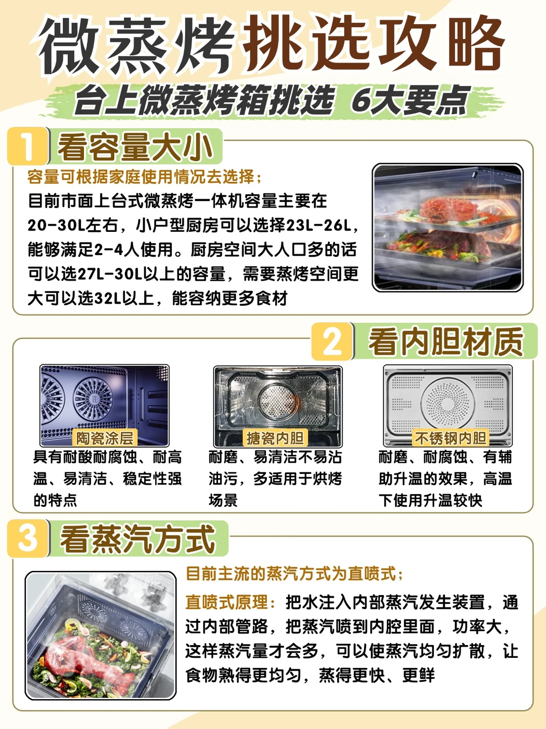 目前市面上台式微蒸烤一体机容量主要在20-30L左右,小户型厨房可以选23L-26L,能够满足2-4人使用。厨房空间大人口多可以选27L-30L以上的容量,需要蒸烤空间更大的可以选32L以上能容纳更多食材
