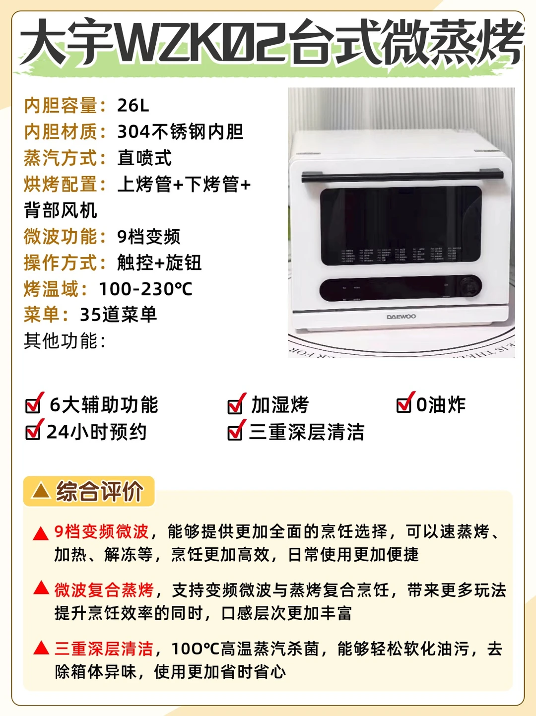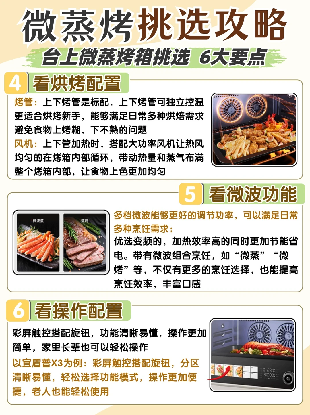 优选变频的,加热效率高的同时更加节能省电。带有微波组合烹饪,如“微蒸”“微烤”等,不仅有更多的烹饪选择,也能提高烹饪效率,丰富口感