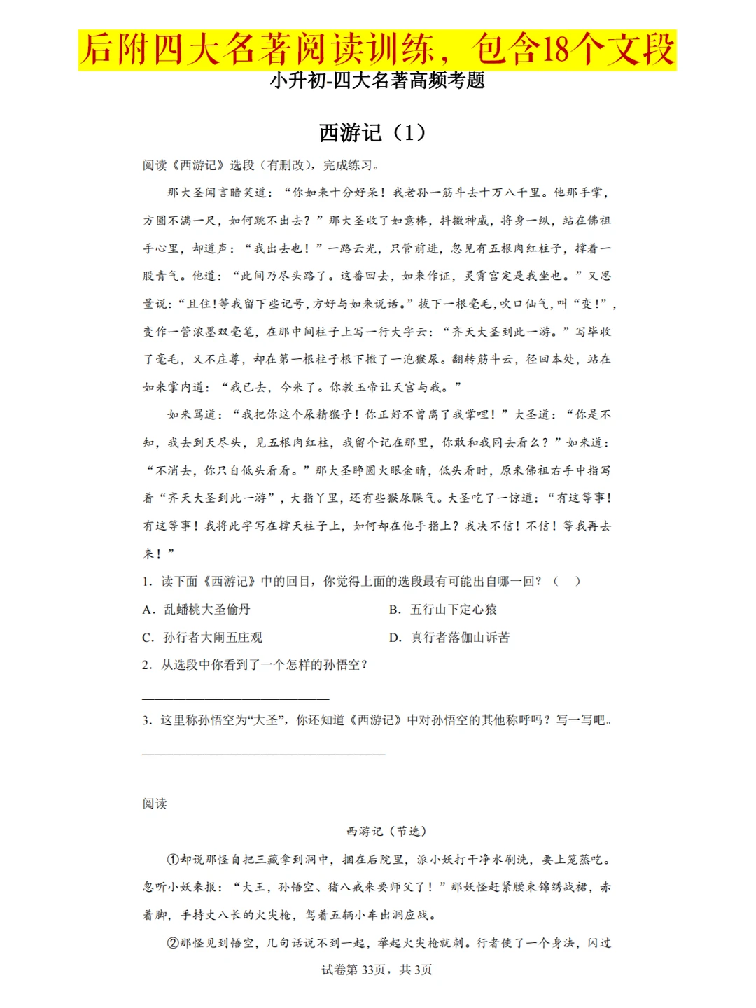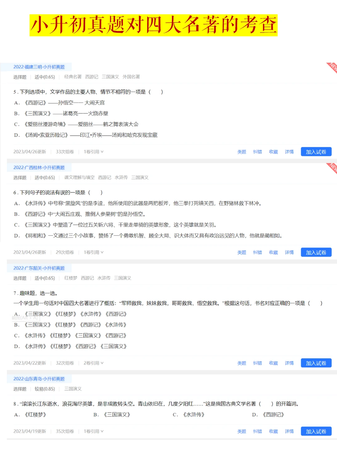 本专题中的阅读文本包含许多经典情节,文学常识收录了小升初常考题型和内容,让学生在欣赏美好片段的同时,增加学生对名著内容的认知,增强对文本阅读的理解能力和對四大名著常识的识记能力。