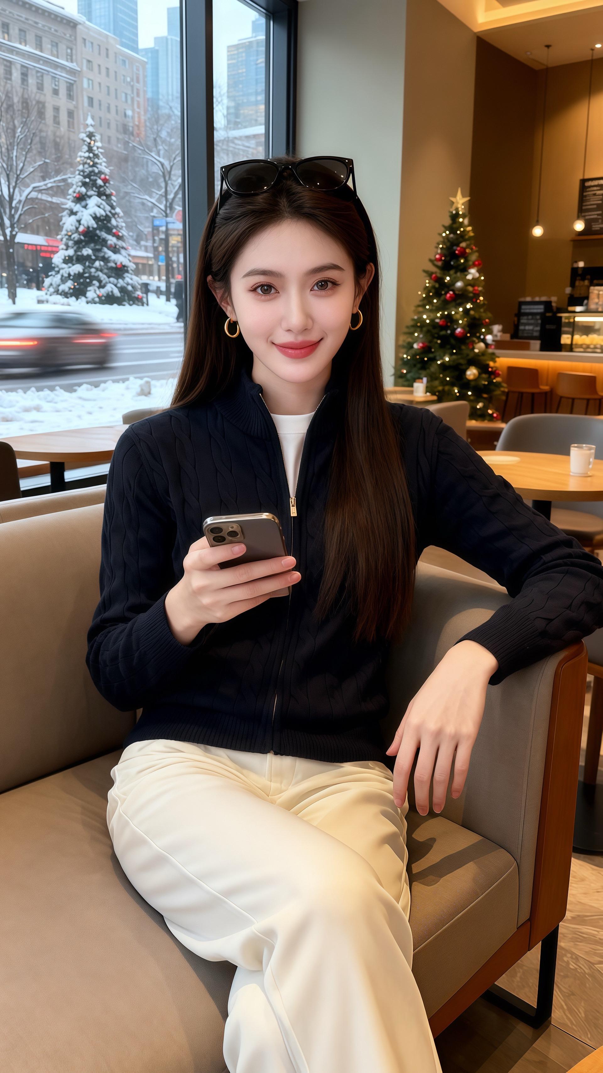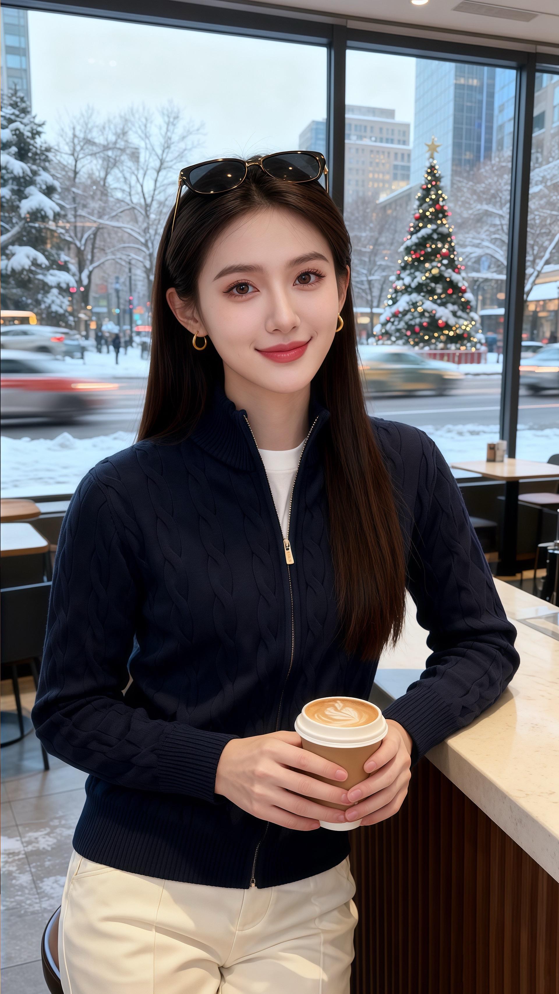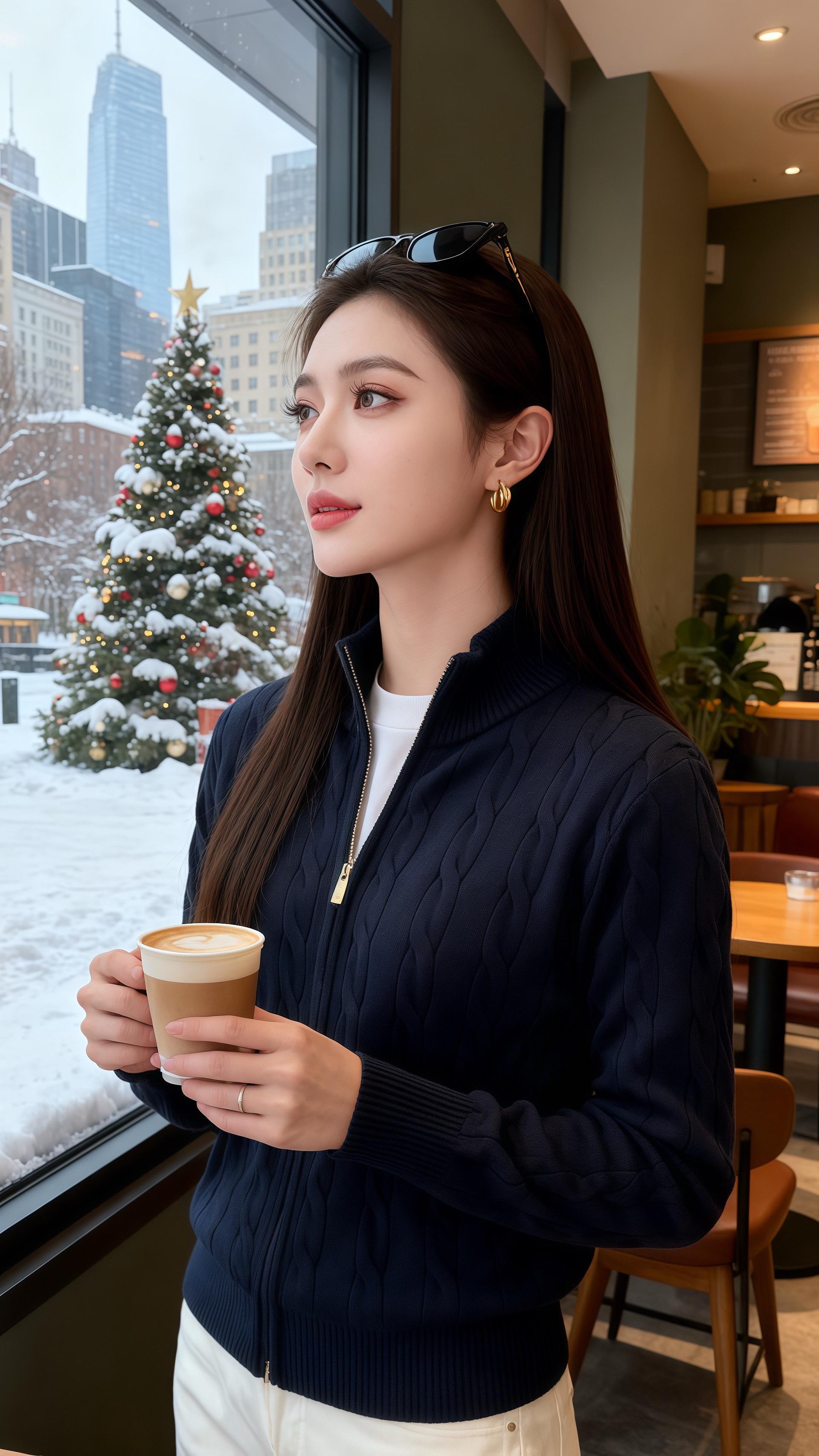 圣诞树下的咖啡店,我又遇见了苏晚。这次她换了藏青绞花针织拉链开衫,立体的绞花纹理带着柔和的肌理感,立领的设计衬得她的下颌线格外流畅,半开的金色拉链露出内搭的米白打底,冷调的藏青与暖调的米白相融,添了几分温柔的层次感。