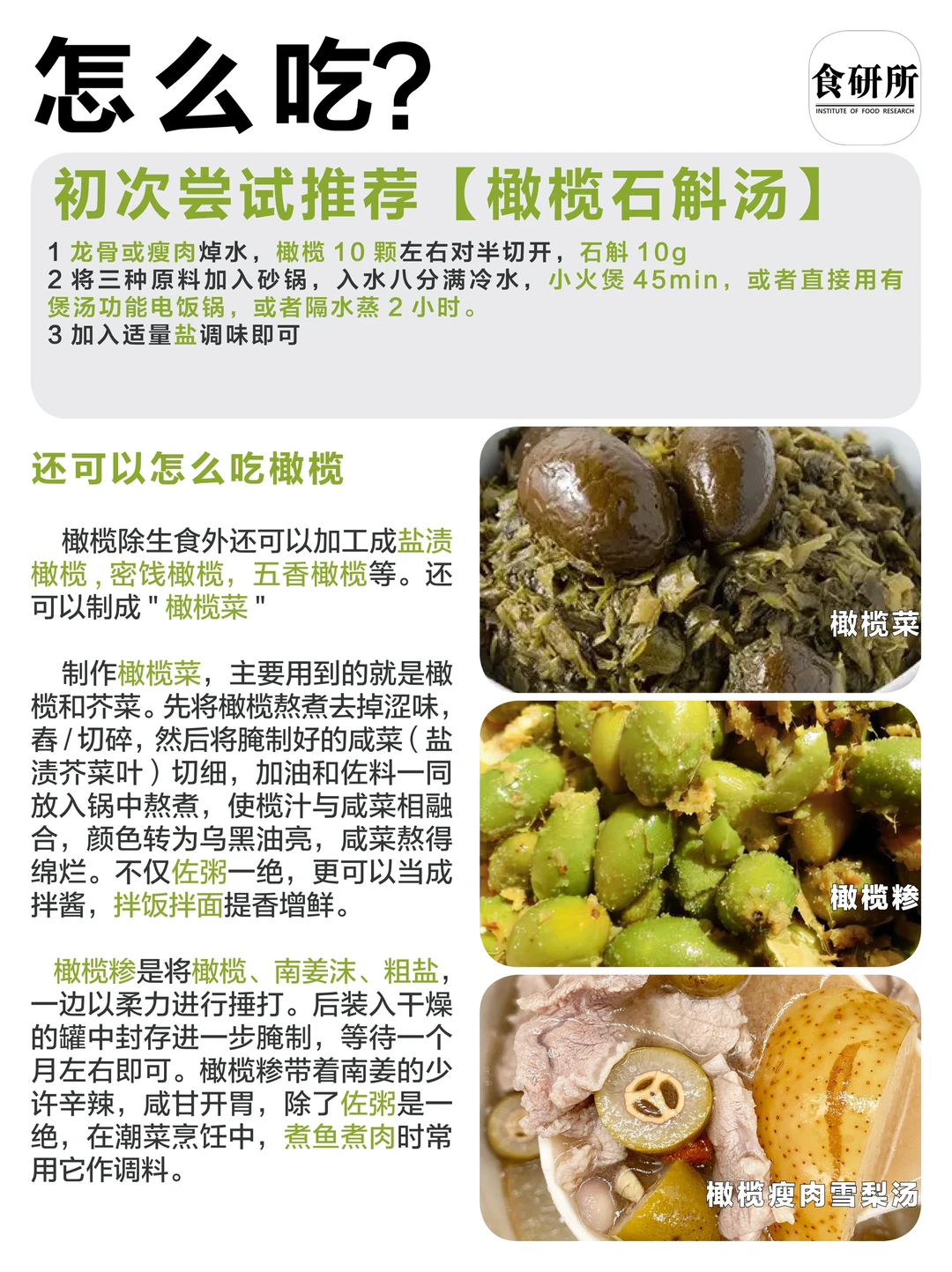 [氛围感R]制作橄榄菜,主要用到的就是橄榄和芥菜。先将橄榄熬煮去掉涩味,舂/切碎,然后将腌制好的咸菜(盐渍芥菜叶)切细,加油和佐料一同放入锅中熬煮,使榄汁与咸菜相融合,颜色转为乌黑油亮,咸菜熬得绵烂。不仅佐粥一绝,更可以当成拌酱,拌饭拌面提香增鲜。