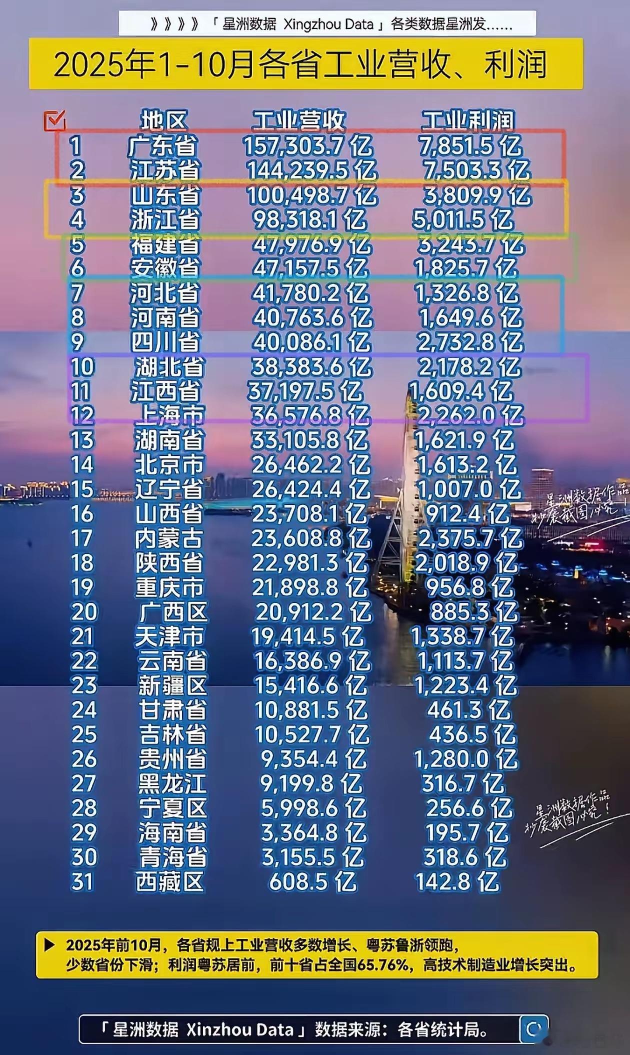 不比不知道,一比下一掉!全国2025年1-10月工业大排名出炉了:广东、江苏第一档无人可敌;山东、浙江第二档游刃有余;福建、安徽第三档出人意料;河北、河南、四川第四档名副其实。广西是第二十位,排在中档偏下水平,很可惜,因为在八十年代初,广西GDP和工业总产值均超过福建,现在福建已经进入第五位了!加油广西!