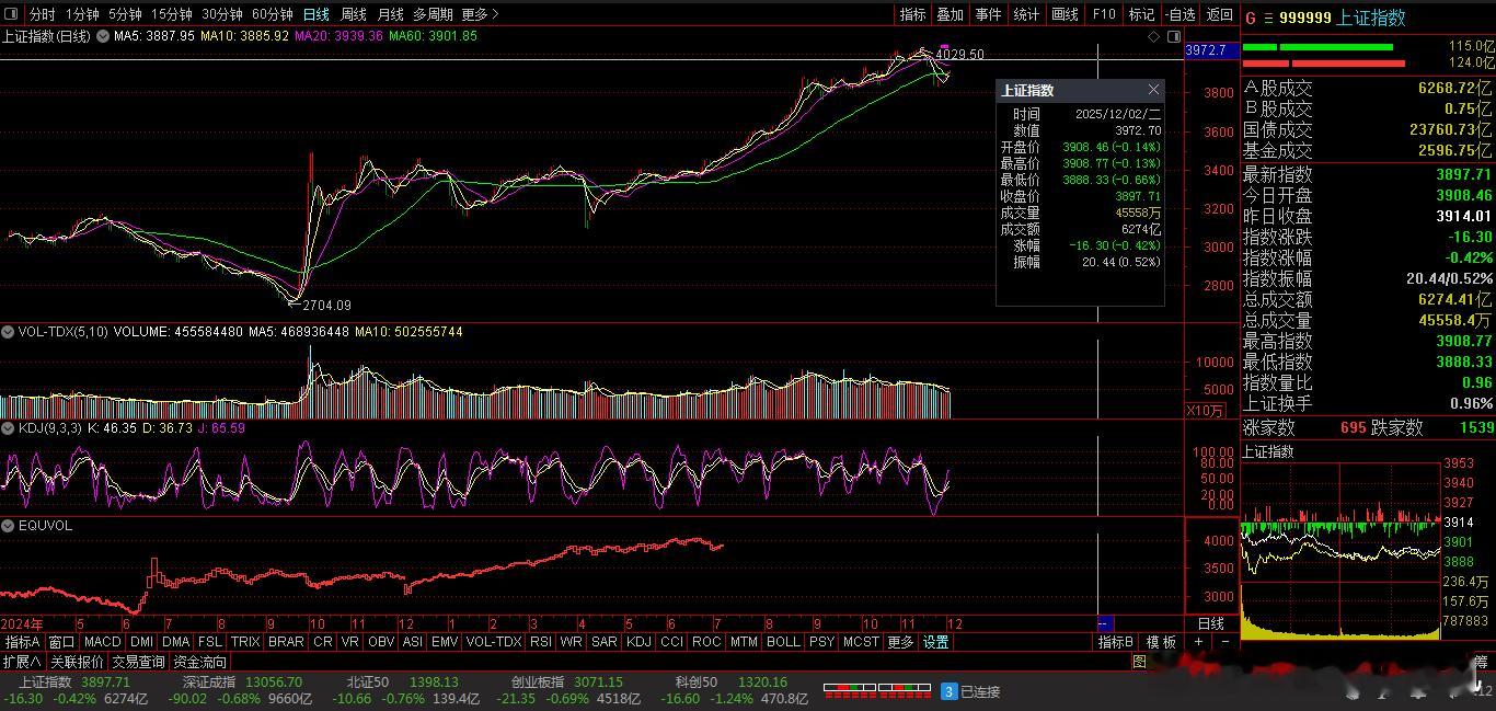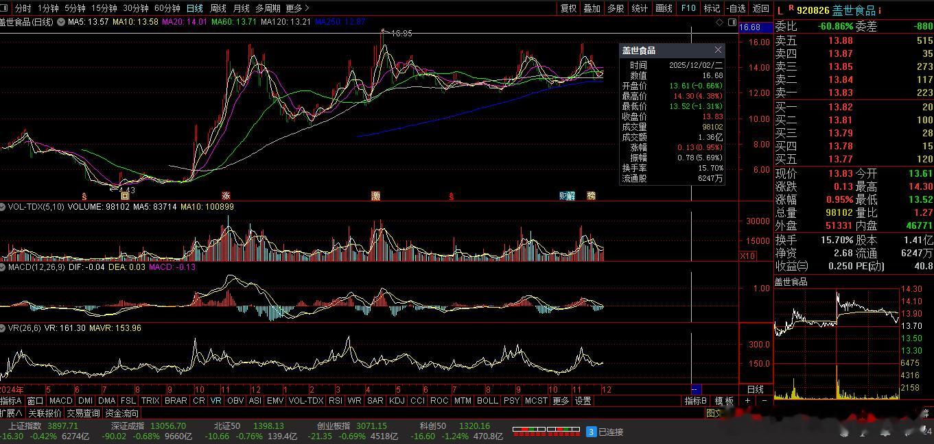 【财富晚茶】今日股市收评:深指跌0.68%:林业震荡回升游戏杀跌导语:作者系《网易号》优质财经领域创作者。曾经原创作者和知名网易号旅游领域创作者。大跨度行业等的写作,颇受网友喜爱。作品发表于2025.12.02.15:18优雅端庄晚风。(标题作品:全球著名林场:自然林场:亚马逊雨林)一、视野焦点:恰似“火眼金睛”920826 盖世食品 盘中03涨1、突破五年箱底视野盘面:前期双底,震荡盘升:2025-12-02 截至15:00:股价报收:13.83元。股指上涨:0.95%。成交总量:98102手,成交金额:1.36亿元。总换手率15.70%,观总市值:19.43亿元。流通市值:8.64亿元。2、凉菜领导品牌主营业务:标准化凉菜研产和销售。公司品牌:中国开胃凉菜领导品牌。3、营收净利优良业绩好转:2025-09-30 三季度报:公司营收:4.4955亿 同比增16.28%。公司净利:3574.3196万 同比增14.48%。二、空方强势:恰似“弱肉强食”1、博弈追踪盘面第一、沪深盘面透析沪深回放:跌宕起伏。早盘:低开三跌,四涨二跌。午盘:四涨五跌,一涨二跌。尾盘:一涨一跌,次低绿盘。第二、透析沪深指数追寻沪深:跌宕起伏。沪指跌0.42%(016.30点),报03897.71点,成交额06274亿。深指跌0.68%(090.02点),报13056.70点,成交额09659亿。创指跌0.69%(021.35点),报03071.15点,成交额04518亿。北指跌0.76%(021.09点),报01398.13点,成交额00139亿。沪深北市:合计成交:16073亿元。2、复盘沪深个股第一、今日个股视野今日观察:涨跌互动。1544上涨,79个股涨停板。3740股下跌,6跌停板。沪深北市:合计成交18896亿元。三、沪深阴棒:恰似“满天阴霾”1、洞察机构尾盘主旋律:沪深强势,尾盘长虹。沪指距9:31-15:00:前1小时放量盘跌,中1小时略量盘跌,后2小时略量盘升。深指距9:31-15:00:前1小时放量盘跌,中2小时略量盘跌,后1小时略量盘升。沪深两市:合计成交:16073亿元。四、资金流向:恰似“水落石出”1、目击主力资金Wind统计显示:主力资金今日净流出310.83亿元;其中,创业板主力资金净流出142.83亿元;沪深300成份股主力资金净流出77.78亿元;科创板主力资金净流出1.12亿元。所属的31个一级行业,今日有8个行业主力资金呈现净流入,其中,轻工制造行业主力资金净流入最多,净流入金额为5.69亿元;行业主力资金净流入居前:农林牧渔、汽车、房地产等。 23个行业主力资金呈现净流出,其中,电子行业主力资金净流出最多,净流出金额为49.84亿元;行业主力资金净流出靠前:通信、电力设备、计算机、有色金属、非银金融等。2、龙虎榜晴雨表收盘龙虎榜数据:机构席位资金合计:净买入约5.54亿元。其中,净买入的个股15只,净卖出的个股9只。机构净买入最多:航天发展,净买入金额约1.67亿元;机构净买入居前:顺灏股份、赛微电子、广和通等股。机构净卖出最多:招商轮船,净卖出金额约9998.98万元;机构净卖出居前:中远海能、福建高速等股。3、涨停板跌停板第一、板块涨停上涨板块:林业、活跃股、近期复牌、风沙治理、海峡西岸等。下跌板块:家电零部件、电机制造、能源金属、次新预增等。第二、个股涨跌沪深个股:跌多涨少,空方强势,略胜一筹。其中,1544上涨,56个股涨停板。3740股下跌,8跌停板。沪深北市:合计成交16073亿元。4、明天趋势先知第一、沪指预测12月03日:沪指突破阻力:03908点看涨,前程似锦;跌破支撑位:03888点看跌,日暮途穷。第二、深指预测12月03日:深指突破阻力:13132点看涨,鹏程万里;跌破支撑位:13011点看跌,不堪造就。五、本创作者:恰似“优质网易”投资投机迷茫之中:给予尽可能有帮助:资本市场风险自负。(优雅端庄晚风《网易号》优质财经领域创作者和原创作者; 违者必究)