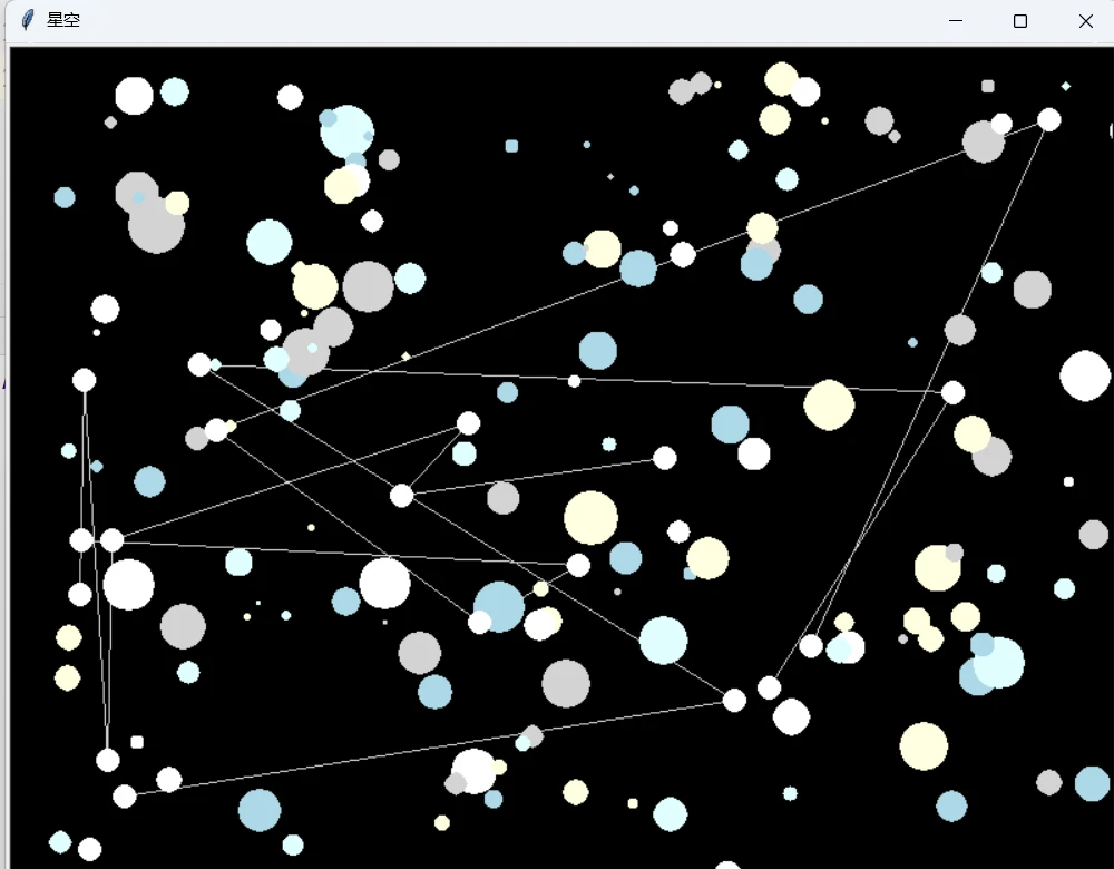 这个程序会创建一个黑色背景的星空,包含随机分布的星星、一些星座连线,以及流星效果。