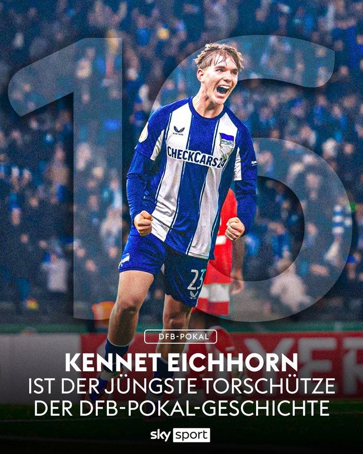 比赛第31分钟,16岁零128天的肯内特-艾希霍恩(KennetEichhorn)为柏林赫塔打入第三球,成为德国杯历史上最年轻的进球者。