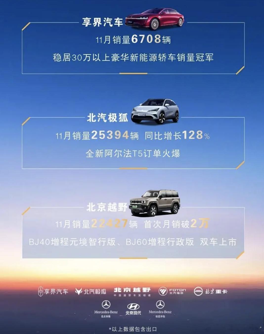 北汽11月销量12月2日,北汽集团公布11月自主品牌乘用车销量54529辆,环比增长14%,同比增长70%。享界品牌11月销量为6708辆;极狐品牌11月销量25394辆,同比增长128%。北京越野11月销量22427辆,首次月销破2万辆。
