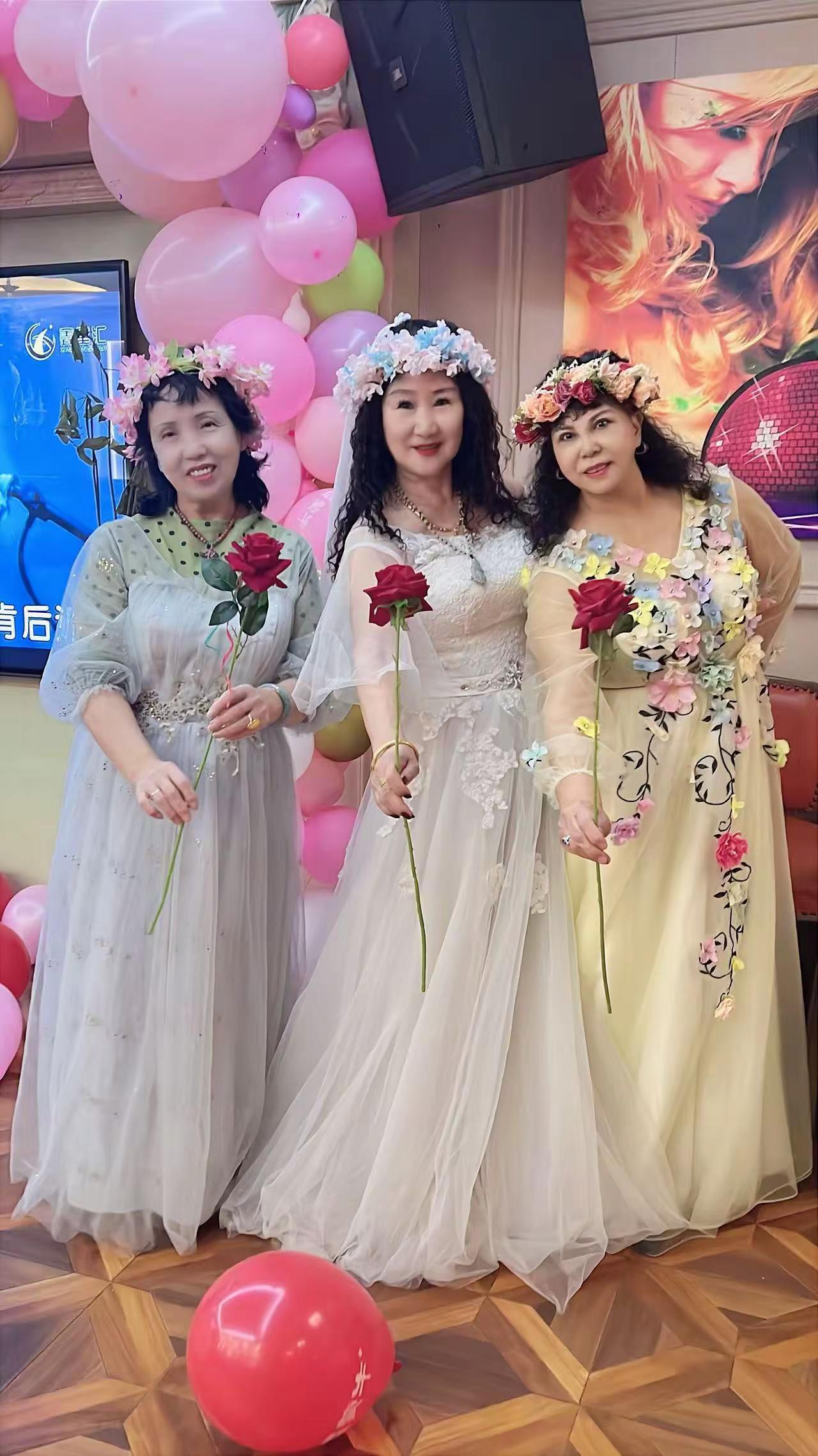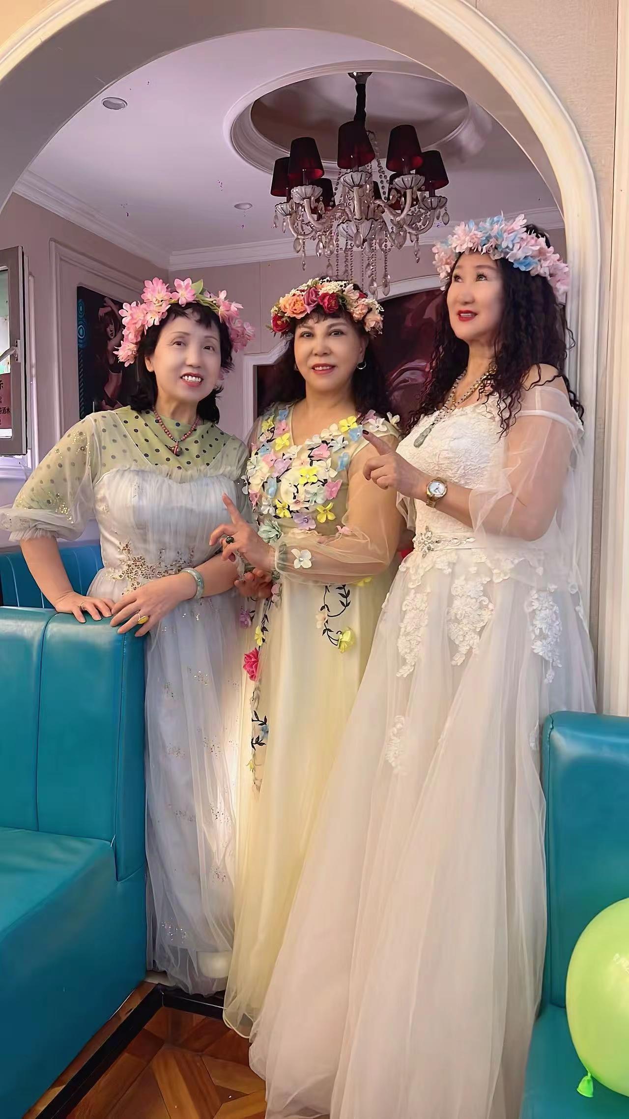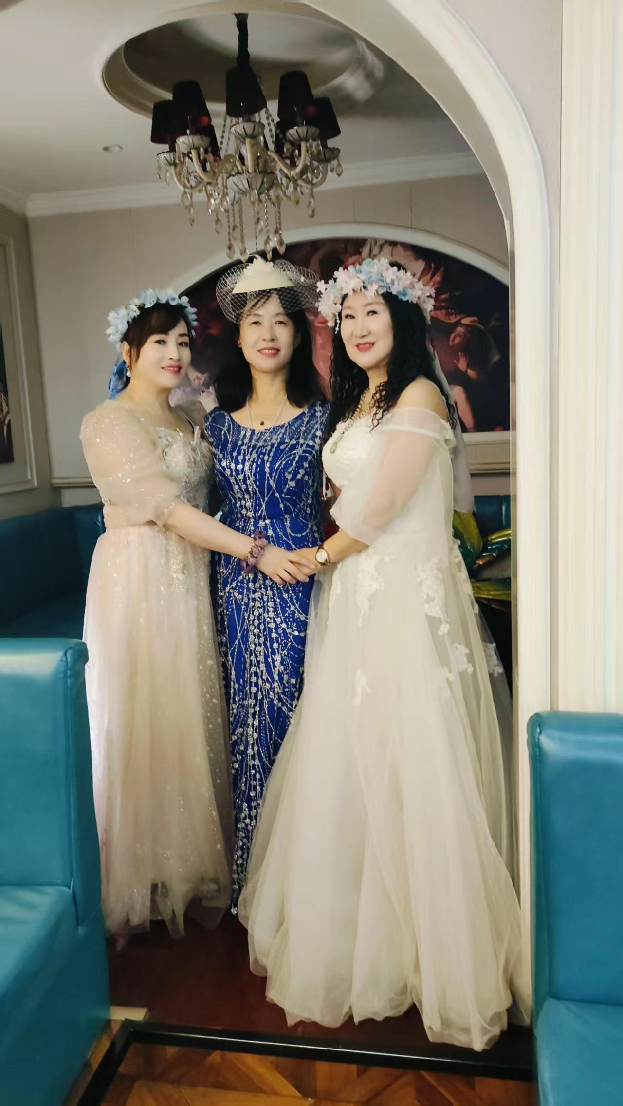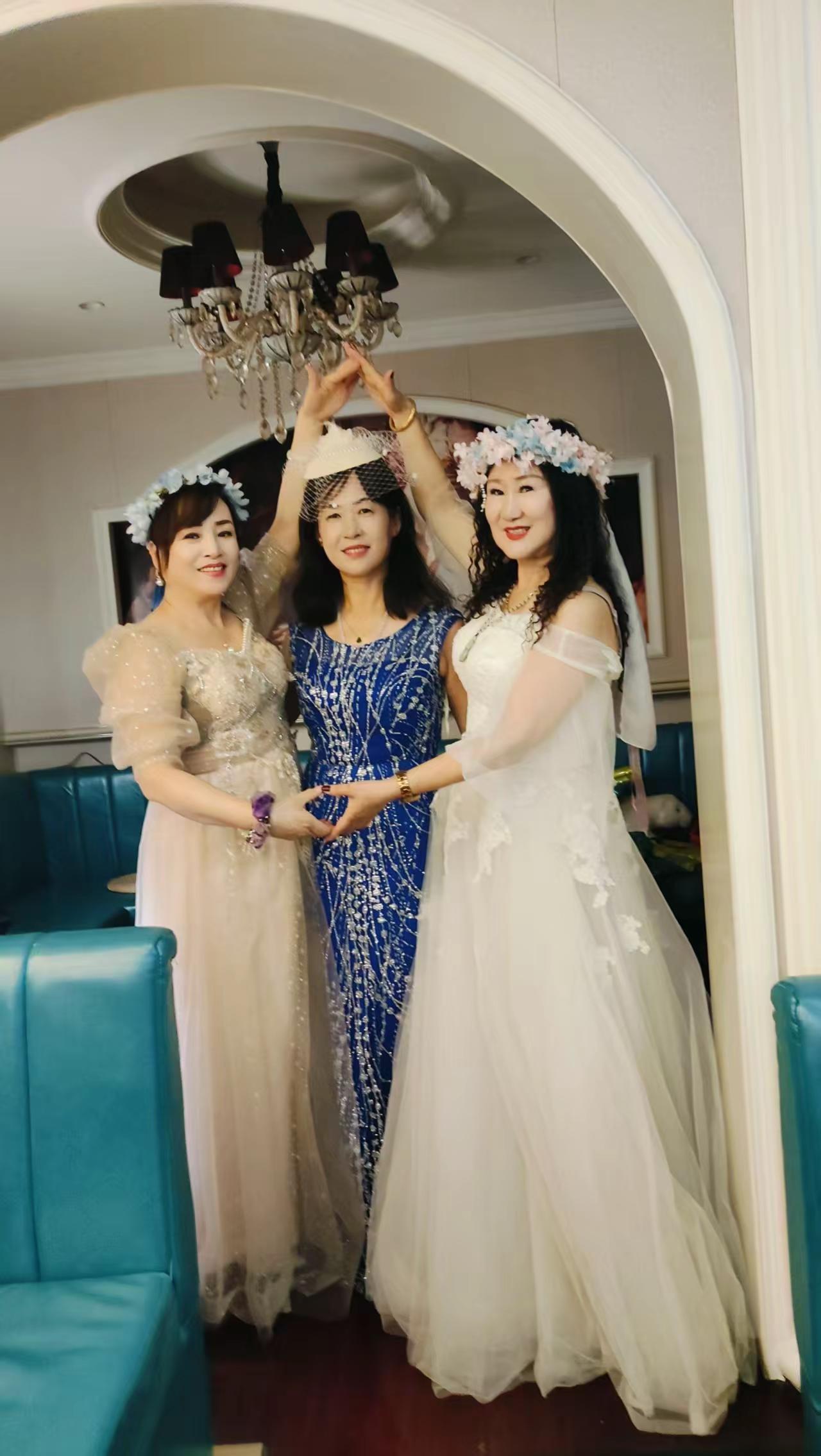 姐妹们开心相聚,一个好姐妹们舞厅,老板娘为我们准备了好多晚礼服。旗袍。民族风服装。更大开眼界的一套婚纱我很高兴,也尝试一下。穿婚纱的感觉。也圆了一生没有穿过婚纱梦!