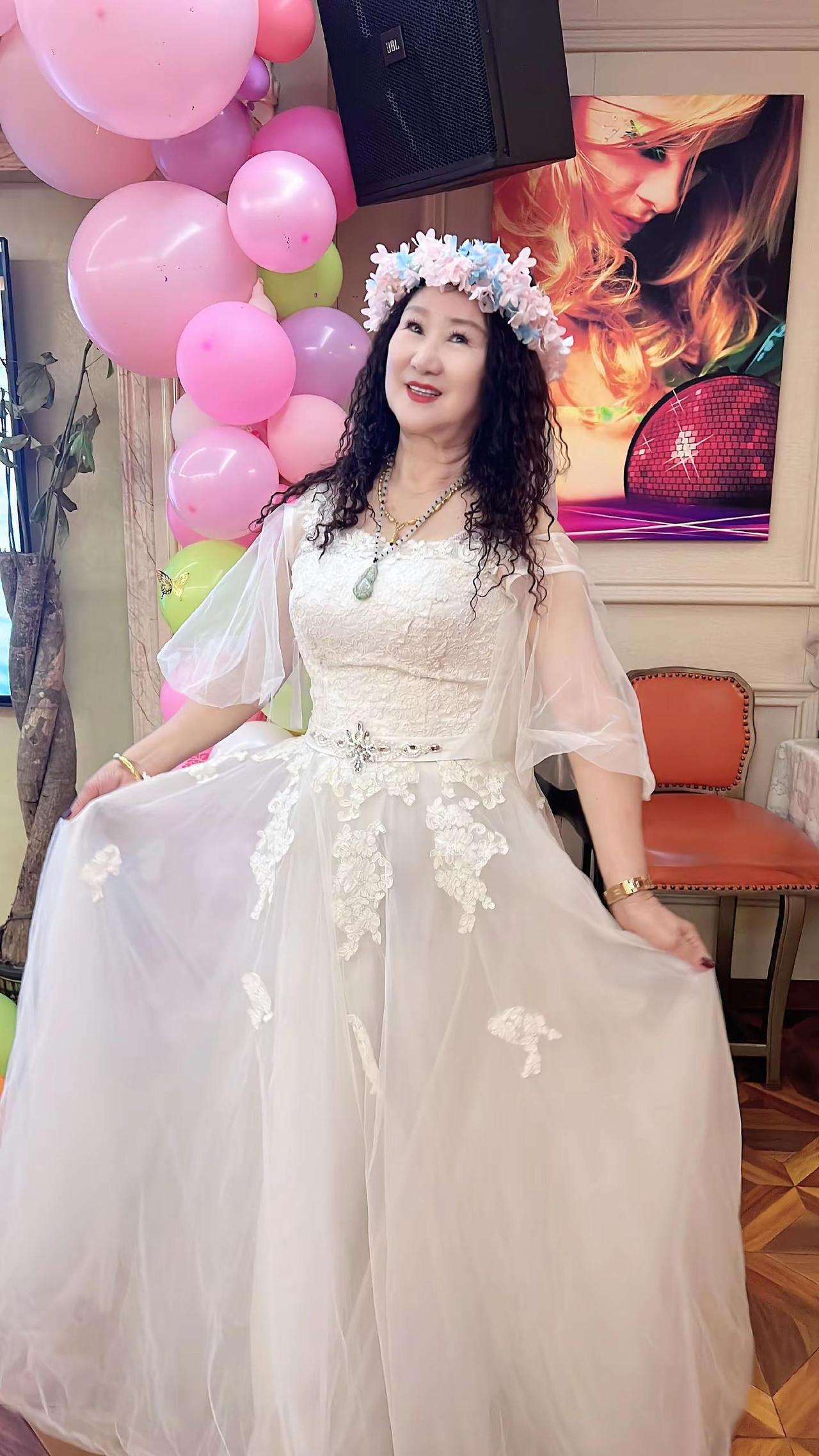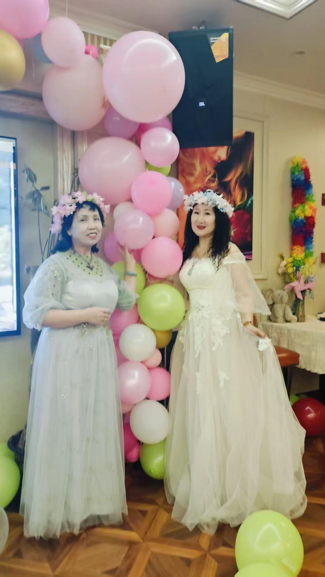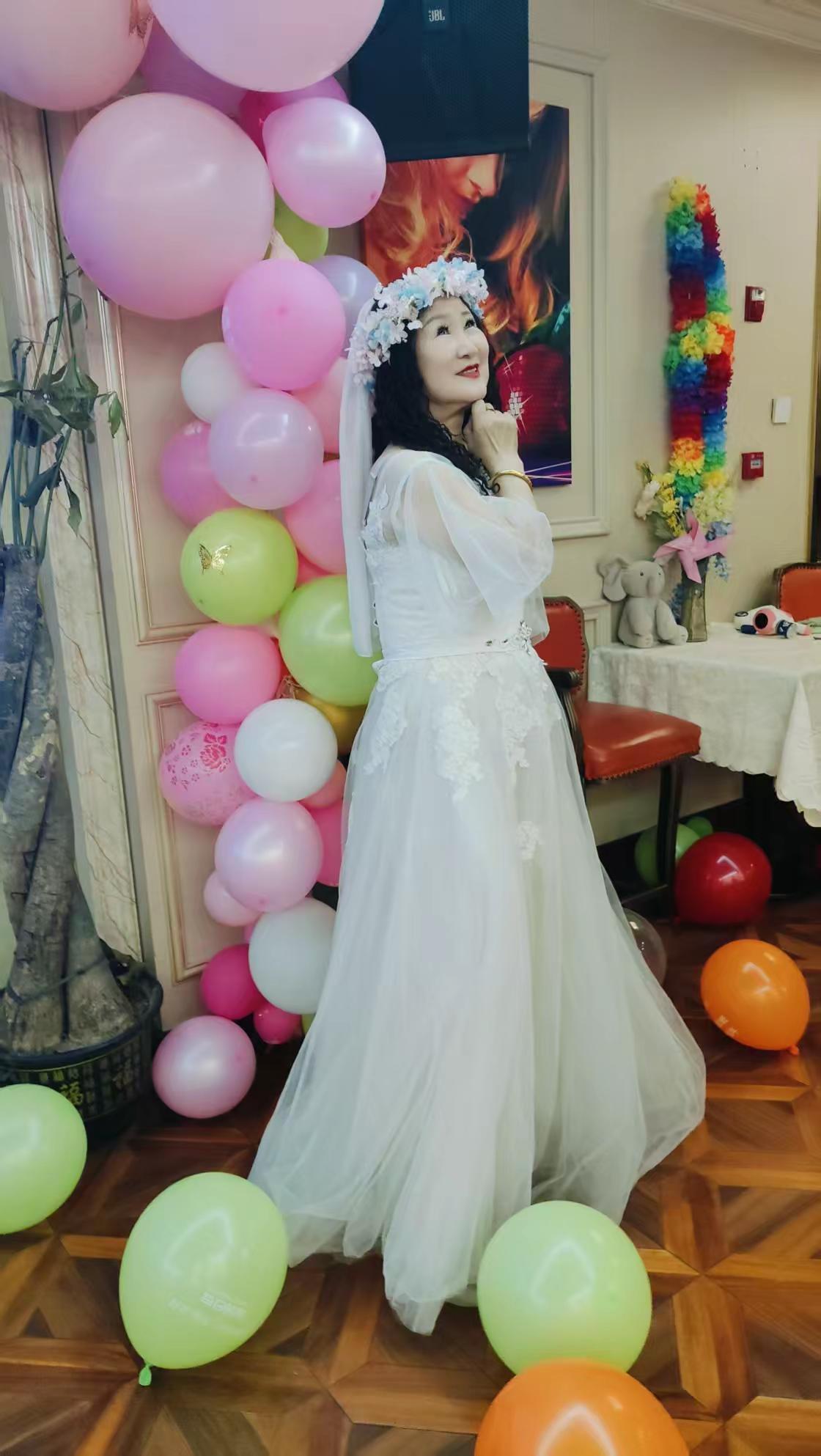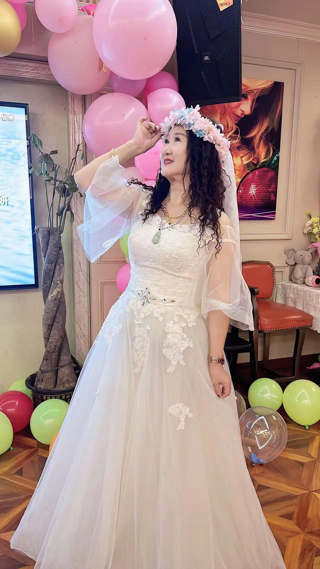 姐妹们开心相聚,一个好姐妹们舞厅,老板娘为我们准备了好多晚礼服。旗袍。民族风服装。更大开眼界的一套婚纱我很高兴,也尝试一下。穿婚纱的感觉。也圆了一生没有穿过婚纱梦!