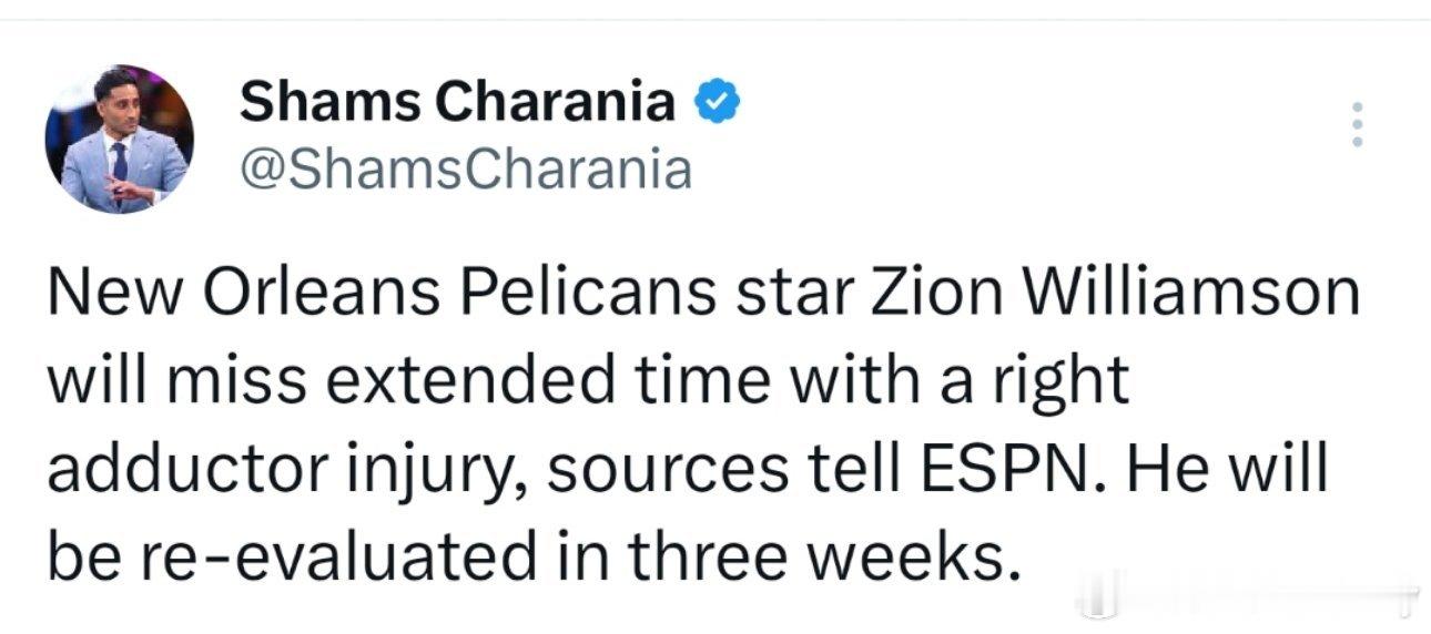 Shams:锡安内收肌受伤,3周后复查。此前,锡安因腿筋伤势缺席了两周,于11月