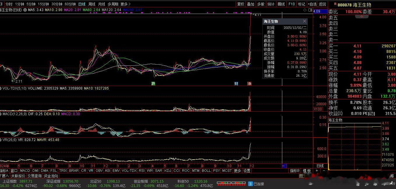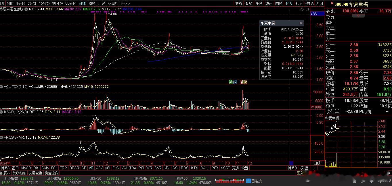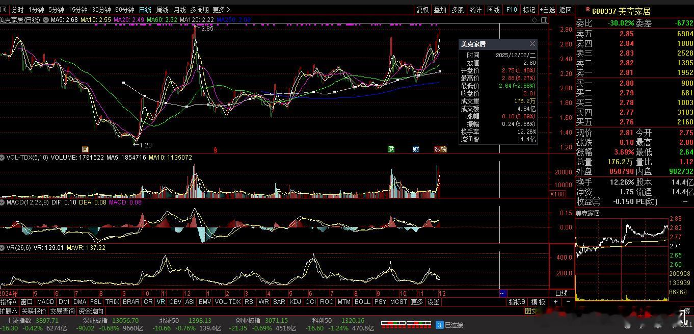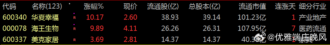【财富晚茶】三元股市收评:沪指跌0.42%:厨卫强势上扬医疗探底导语:作者系《网易号》优质财经领域创作者。曾经原创作者和知名网易号旅游领域创作者。大跨度行业等的写作,颇受网友喜爱。作品发表于2025.12.02.15:18优雅端庄晚风。一、栖霞建设:八年箱底600533 栖霞建设 盘中01涨1、八年筑底:底部突破今日视野:前期三顶:酝酿突破。2025-12-02 截止15:00:收盘股价:2.76元,上涨1.10%。成交总量:249304手。成交金额:6828万元。总换手率:2.37%。总市值达:28.98亿元,流通市值:28.98亿元。2、地产开发:行业翘楚主营业务:房地产开发-租赁物业管理。公司品牌:全国房地产界盛誉现代化企业集团。3、营收净利:优质公司业绩减亏:2025-09-30 三季度报:公司营收:公司营收:45.2216亿 同比增243.73%,实现1051.9887万 同比增106.05%。二、多空搏杀:沪深绿盘1、追踪盘面:蛛丝马迹沪深场景:早盘:低开三跌,四涨二跌。午盘:四涨五跌,一涨二跌。尾盘:一涨一跌,次低绿盘。看点之一:沪深股指:沪指低开:盘中震荡,瞬间下探。看点之二:两只乌鸦:深创两指:一度跌逾1%。看点之三:沪深北市:合计成交:16073亿元。场内个股:3740股飘绿。2、板块涨跌:风口依然涨跌观察:板块见证。板块拉升:厨卫、零售、煤炭、保险、地产等。板块走低:医疗、有色、传媒、半导体、券商、汽车、酿酒等。概念活跃:两岸融合、海南自贸等。3、技术看盘:涨跌位置观K线提示:精彩多空博弈。12月03日:沪指突破阻力:03908点看涨,前程似锦;跌破支撑位:03888点看跌,日暮途穷。深指突破阻力:13132点看涨,鹏程万里;跌破支撑位:13011点看跌,不堪造就。三、三元板块:风口潜水1、追踪盘面:视角视野三元强势,沪深脉冲。51股上涨,涨幅5%以上:5股涨停板。50股下跌,跌幅5%以上:1股跌停板。涨幅0%:21股0停板。涨幅0.00%+上涨个股:21+51=72股票赚钱。沪深两市:合计成交16073亿元。总体归纳:三元股票:盘口强势。2、追踪盘面:主力进退换位思考:沪深弱势,尾盘反弹。沪指距9:31-15:00:前1小时放量盘跌,中1小时略量盘跌,后2小时略量盘升。深指距9:31-15:00:前1小时放量盘跌,中2小时略量盘跌,后1小时略量盘升。沪深两市:合计成交:16073亿元。四、透析个股:聚焦涨跌1、涨幅榜眼:处排查摸主旋律:涨幅榜之中:寻找启动603077 和邦生物000078 海王生物000727 冠捷科技涨幅榜-1:603077 和邦生物主营业务:化工农药饲料添加剂-玻璃及制品光伏材料-盐磷矿研产和销售。公司品牌:草甘膦行业的市场领导者。涨幅榜-2:000078 海王生物主营业务:生物生化制品-海洋药物-海洋生物制品-中成药研造和销售。公司品牌:国内实力雄厚综合性大型医药他头部企业。涨幅榜-3:600337 美克家居主营业务:家具-配套家居的研产和销售。公司品牌:多品牌多渠道一体国际综合家居消费品头部公司。2、跌幅榜眼:处排查摸主旋律:跌幅榜之中:寻找金子300477 ST合纵 300391 *ST长药 300237 ST美晨跌幅榜-1:300477 ST合纵主营业务:配变电-控制设备-锂电池正极前驱体研造和销售。公司品牌:一流配电智慧能源服务商先进锂电池材料前驱体供应商。跌幅榜-2:300391 *ST长药主营业务:医药制造-通用设备制造-新能源的研产和销售。公司品牌:亚洲最有影响力道地药材全产业链头部供应商。跌幅榜-3:300237 ST美晨主营业务:橡胶非轮胎-园林绿化D 研产和销售。公司品牌:国内外非轮胎橡胶制品重要综供商和头部企业。3、潜力榜眼:处排查摸主旋律:潜力榜之中:寻找估值002496 *ST辉丰 300301 *ST长方 000669 ST金鸿潜力榜-1:002496 *ST辉丰主营业务:生物农资-农资电商-石化仓储供应链-项目投资。公司品牌:中国领先亚临界小分子高温裂解工艺高科技专利产品和头部企业。潜力榜-2:300301 *ST长方主营业务:LED照明光源器件。公司品牌:LED照明光源器件头部企业。潜力榜-3:000669 ST金鸿主营业务:天然气。公司品牌:国内最具实力的综合性清洁能源服务商。五、本创作者:优质网易投资投机迷茫之中:给予尽可能有帮助:资本市场风险自负。(优雅端庄晚风《网易号》优质财经领域创作者和原创作者; 违者必究)