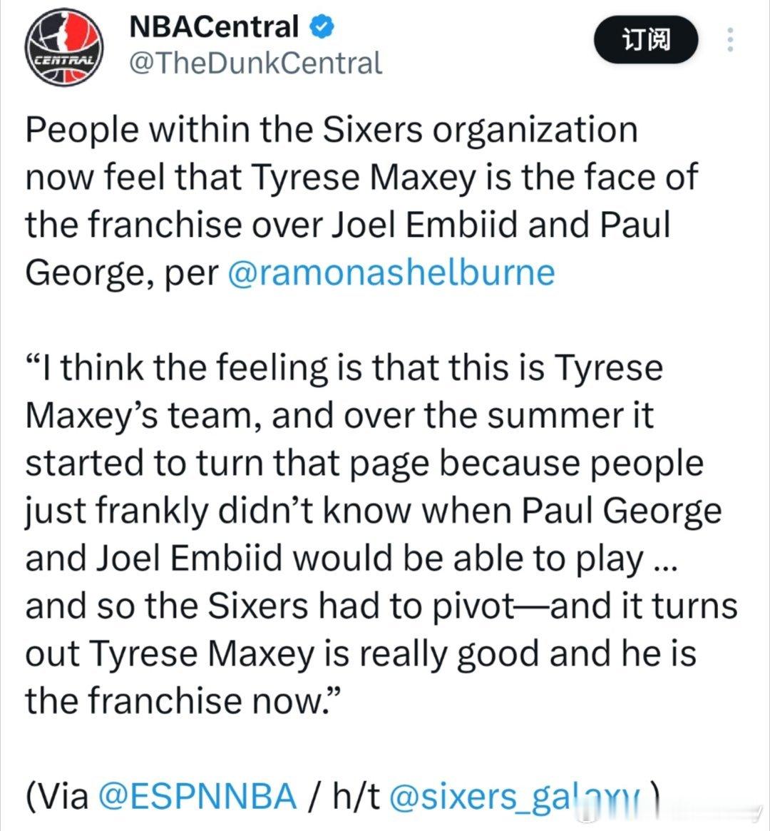 Ramona Shelburne:76人内部认为,马克西现在是球队的领袖,他比恩比德和乔治更适合当球队门面。“我认为现在的感觉是:这是泰瑞斯·马克西的球队。而且这个变化其实从夏天就开始了,因为当时大家坦白讲,并不知道保罗·乔治和恩比德什么时候能上场....所以 76 人必须调整方向——结果事实证明马克西真的很厉害,而现在他就是球队的当家球星。”马克西本赛季场均出场40.7分钟领跑全联盟,得到32.3分4.8板7.6助1.5抢断0.8盖帽。
