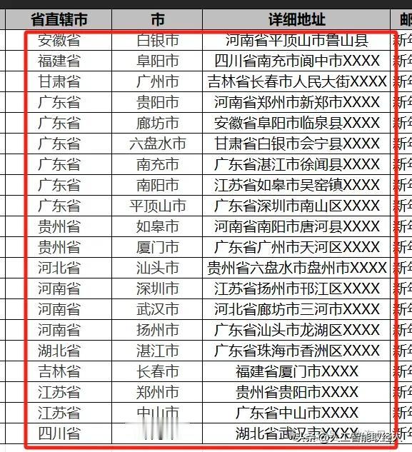 这与我之前为朋友小李做过的一个python自动化项目需求不谋而合:小李在一家快递公司做数据分析师,当时他遇到了一个极其棘手的问题:因为操作失误,数据表里的详细配送地址和地址所在的市不是一一匹配的,我猜想应该是有人在做排序时应该选择"扩展选定区域"而错选成了"以当前选定区域排序"总之造成的结果就是小李拿到的几万行数据省份、市区与详细配送地址是错误的对应关系。这就需要在关键词列省直辖市和市匹配上全称列详细地址列