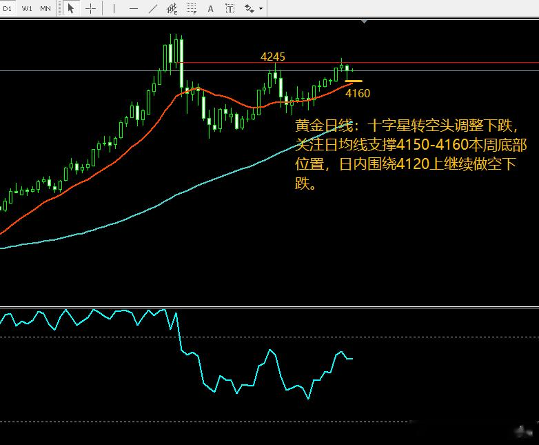 1.日线十字星转阴调整下跌,且凌晨破低最低到4163靠近日线级别调整支撑附近,日线形态来看,今日继续延续空头下跌,下方支撑关注4150-4160区域反复做多继续大涨;