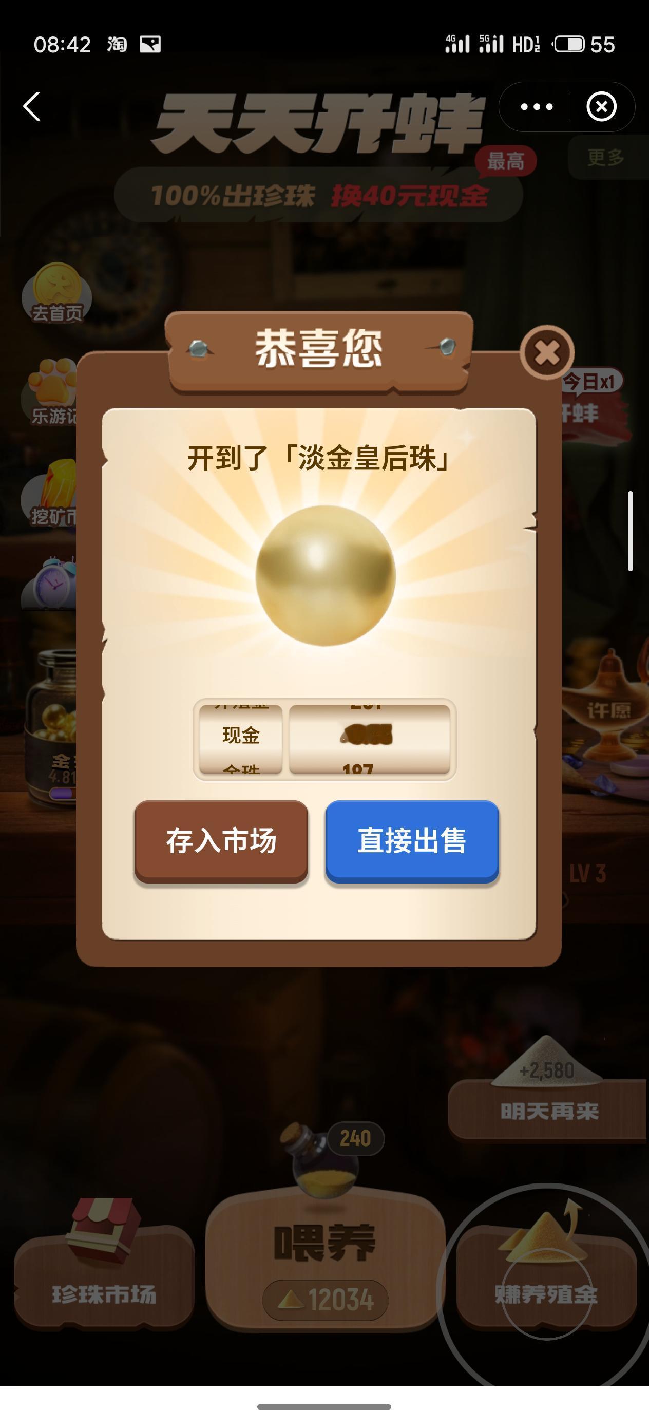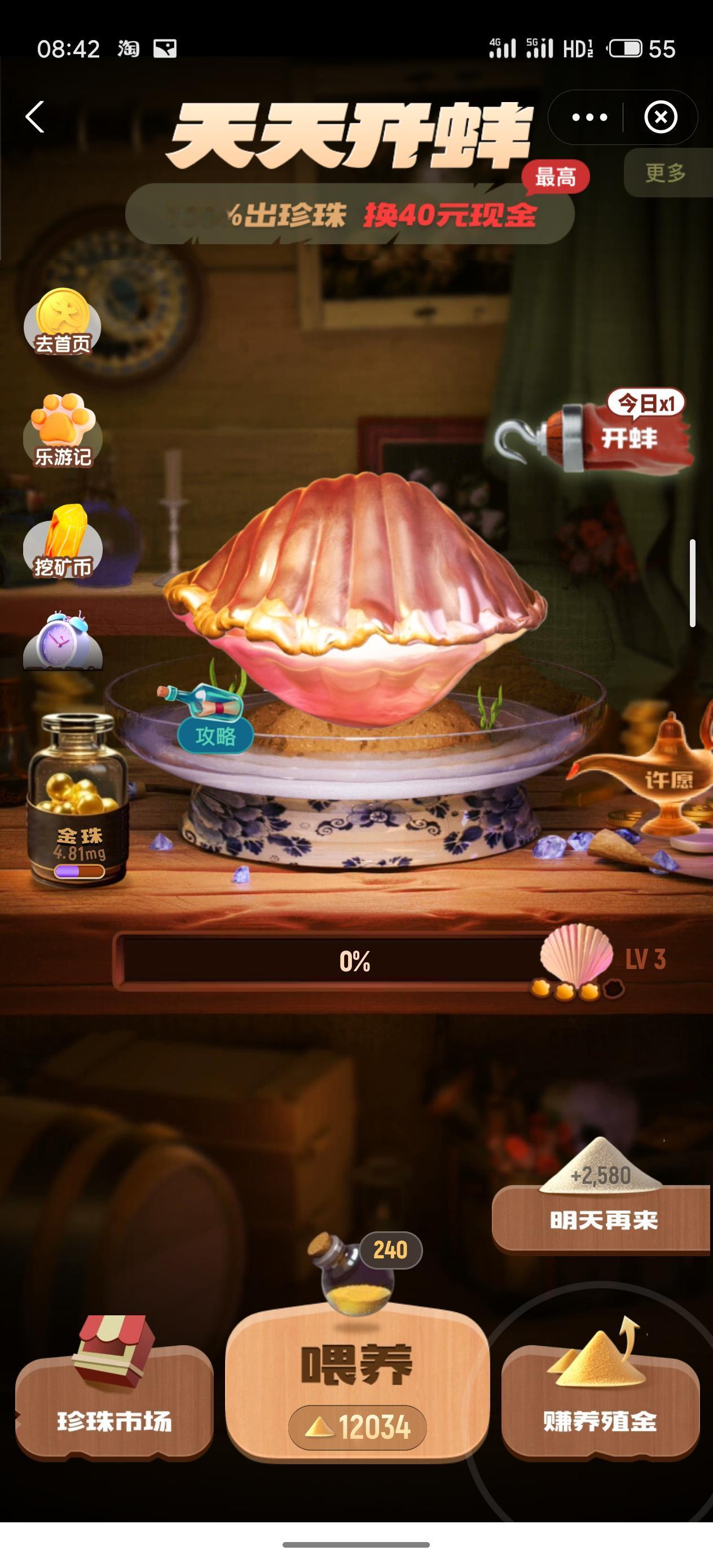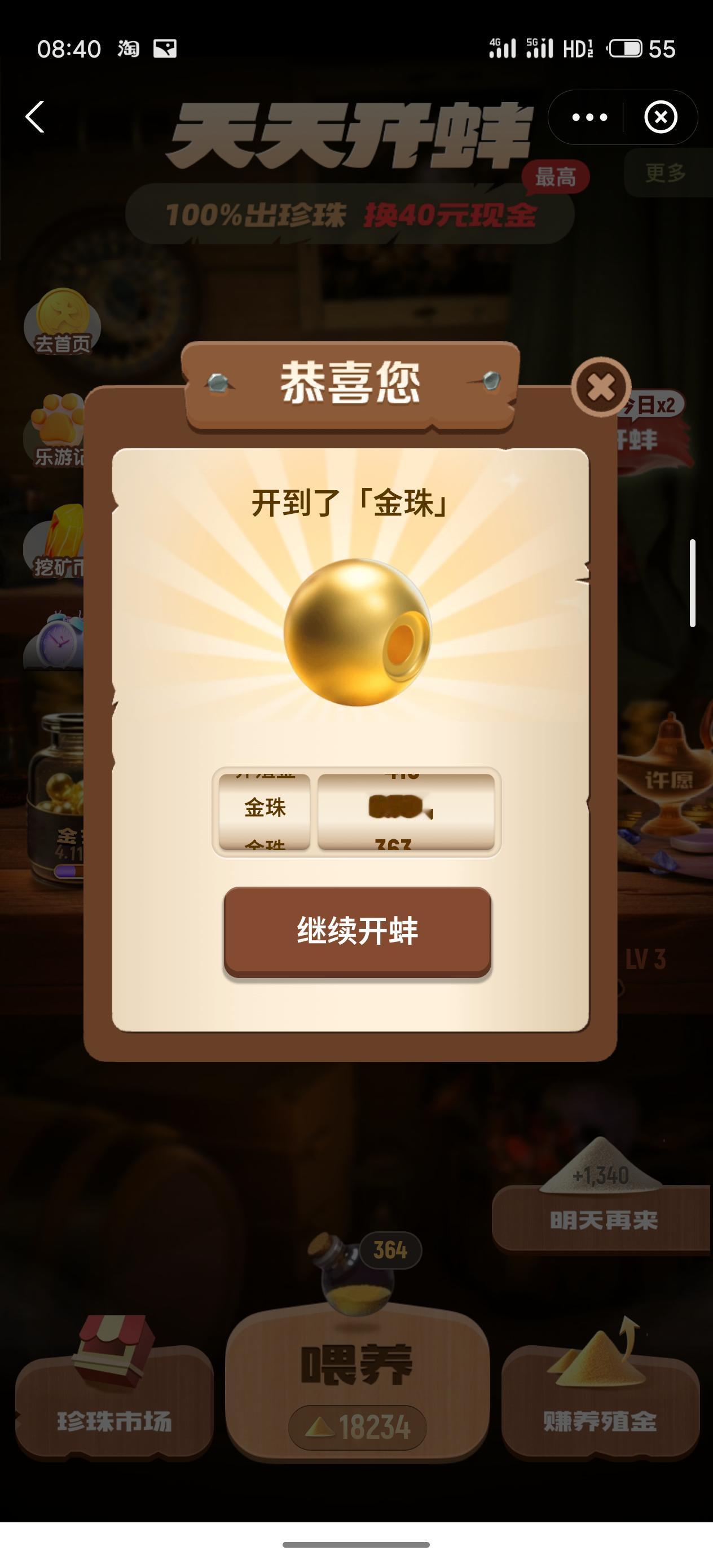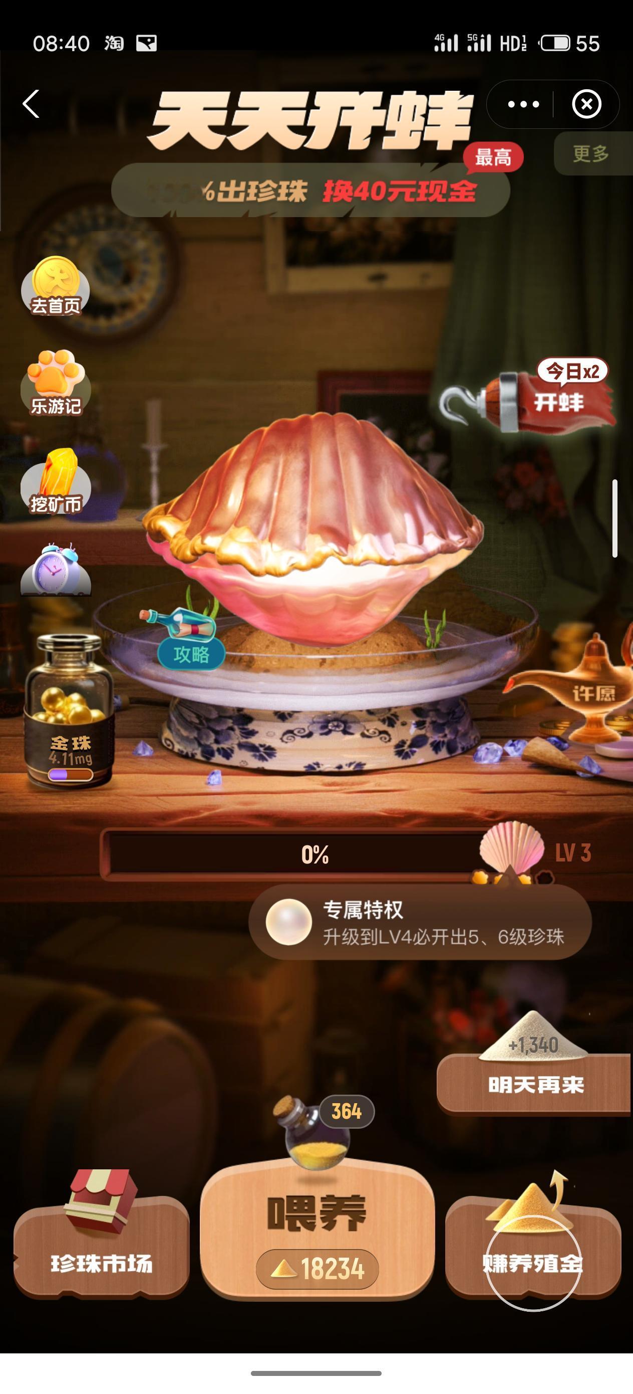 连续三天 每次喂养的时候我都仔细观察了 大约数据是11次可以升级到LV2,124次可以直接升级到LV3 每天两次开蚌的机会 开蚌之前,如果你的养殖基金能超过124+124=248 那么就可以先升级到3级开一次,再升到3再开一次 大概率开到好东西 再积攒几天,我来测算下升到LV4需要多少次 按顺序看截图 488-364=124 开出金珠 然后 364-240=124 开出淡金黄后珠