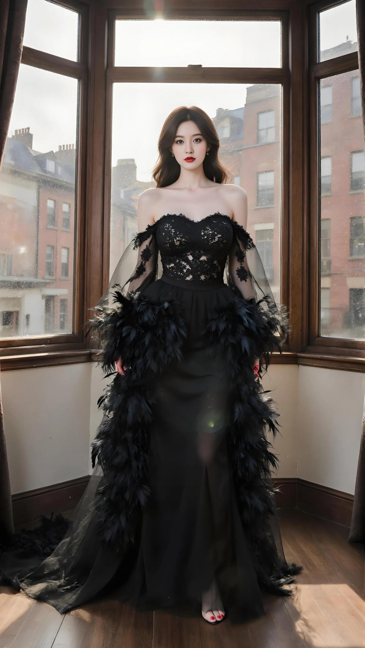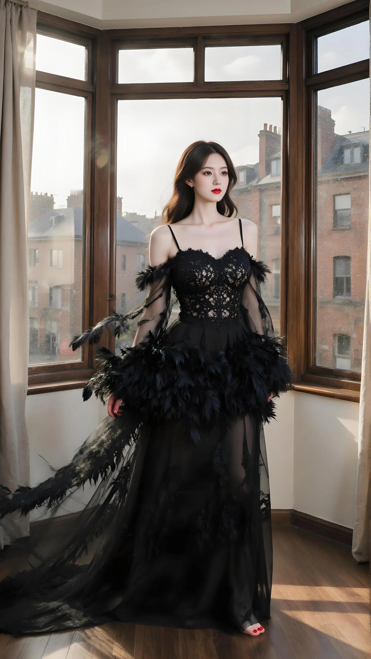 窗棂框住云影,她身着墨色蕾丝与羽毛织就的夜,吊带轻锁香肩,纱裾漫过木地板,像把旧