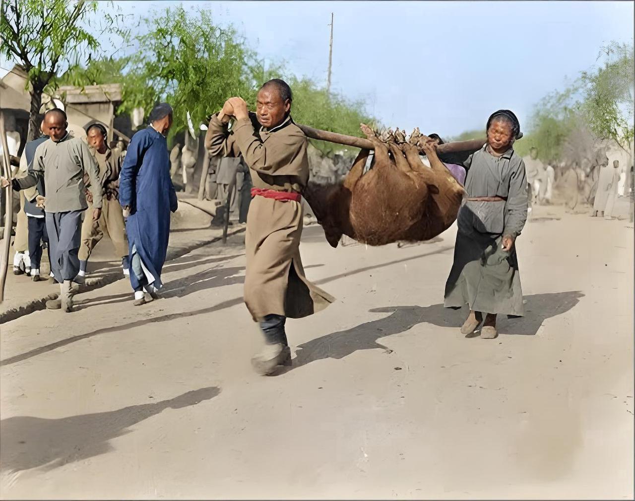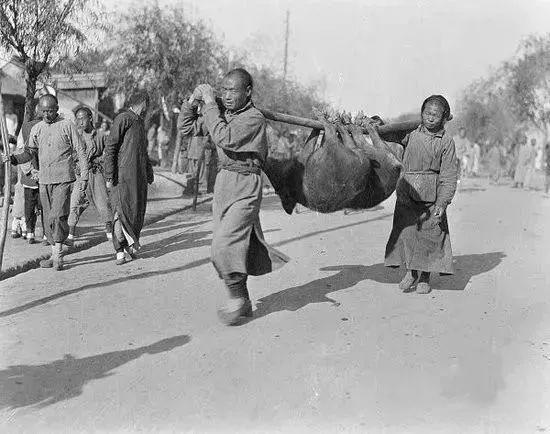 这张黑老照片定格了晚清市井街头的一幕,两名身着粗陋布衣的民众,用长木棍合力抬着两头猪沿街行进,衣衫单薄、动作吃力,背景里稀疏的行人与朴素的街巷,尽显当时底层生活的平实质感。 这大概率是帮大户人家运送年猪,筹备“杀年猪”的年节事宜。而当时普通百姓的生活确实普遍清苦:农业生产力低下,叠加赋税、灾荒等压力,多数底层民众平日难获温饱,肉类更是稀缺之物,即便到了年节,也只有少数家庭能勉强吃到荤腥。
