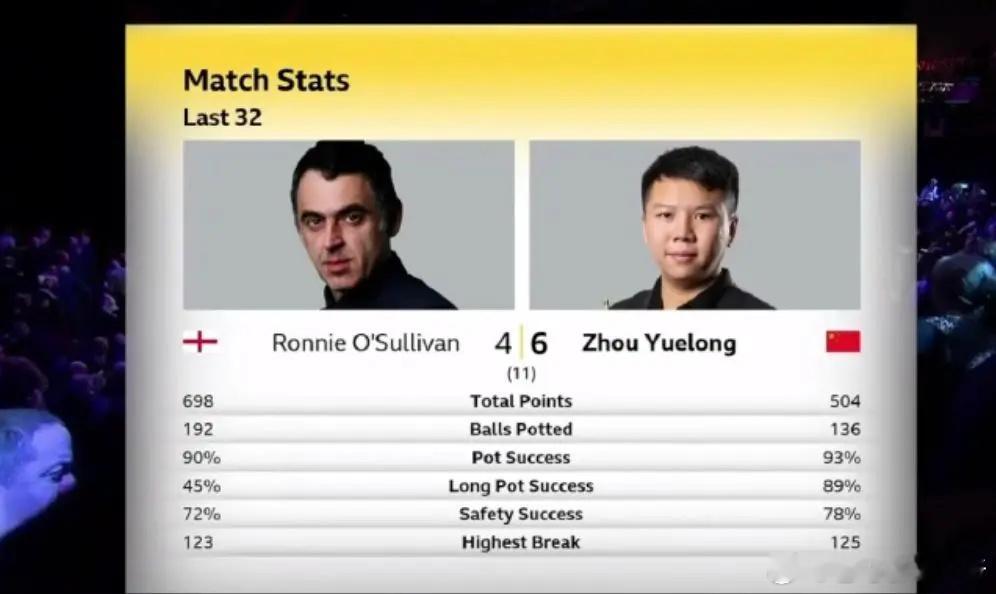 伟大的6-4!周跃龙生涯首胜奥沙利文+结束7连败 中国7人杀入16强斯诺克 北京时间12月3日凌晨,斯诺克英锦赛32进16的比赛继续进行。在一场焦点战中,中国选手周跃龙6-4击败了奥沙利文,生涯首胜对手。一共有7名中国选手进入16强。职业生涯中,周跃龙此前一共7次交手奥沙利文,全部落败。今日再战,周跃龙渴望改写历史。前2局,周跃龙手感出色,全部拿下,取得2-0的领先。随后,奥沙利文手感火热,连续打出单杆71分、123分,连追2局。前7局结束,周跃龙4-3领先。第8局,周跃龙手感火热,单杆125分,以125-0拿下这一局,取得5-3的领先,拿到赛点。第9局,奥沙利文挽救赛点。不过,周跃龙在第10局抓住机会,以71-58取胜。最终,周跃龙6-4击败了奥沙利文,尽管他整场比赛只有一次单杆破百。这也是周跃龙生涯首次击败奥沙利文。全场比赛,奥沙利文的手感不佳,长台成功率只有45%。英锦赛首轮比赛结束后,一共有7名中国选手进入16强,创造了历史。这7名选手分别是斯佳辉 、吴宜泽、庞俊旭、赵心童、丁俊晖、张安达、周跃龙,其中既包含丁俊晖这样的老将,也包括诸多后起之秀。1/8决赛中,4名中国选手被分到了上半区,3名中国选手被分到下半区。其中,张安达将和赵心童进行中国内战。理论上,存在中国队选手包揽八强上半区的可能。附16强的分区情况上半区:贾德·特鲁姆普 vs 斯佳辉丁俊晖 vs 斯科特·唐纳森马克·威廉姆斯 vs 庞俊旭吴宜泽 vs 尼尔·罗伯逊下半区:巴里·霍金斯 vs 埃利奥特·斯莱塞马克·塞尔比 vs 周跃龙约翰·希金斯 vs 肖恩·墨菲张安达 vs 赵心童