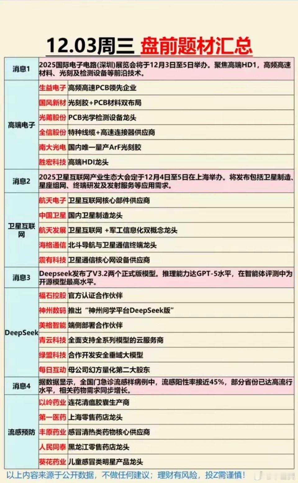 12.3周三 市场热点题材+投资逻辑!1.高端电子电路展览会2.卫星互联网3.Deepseek新模型发布4.流感预防,抗流感