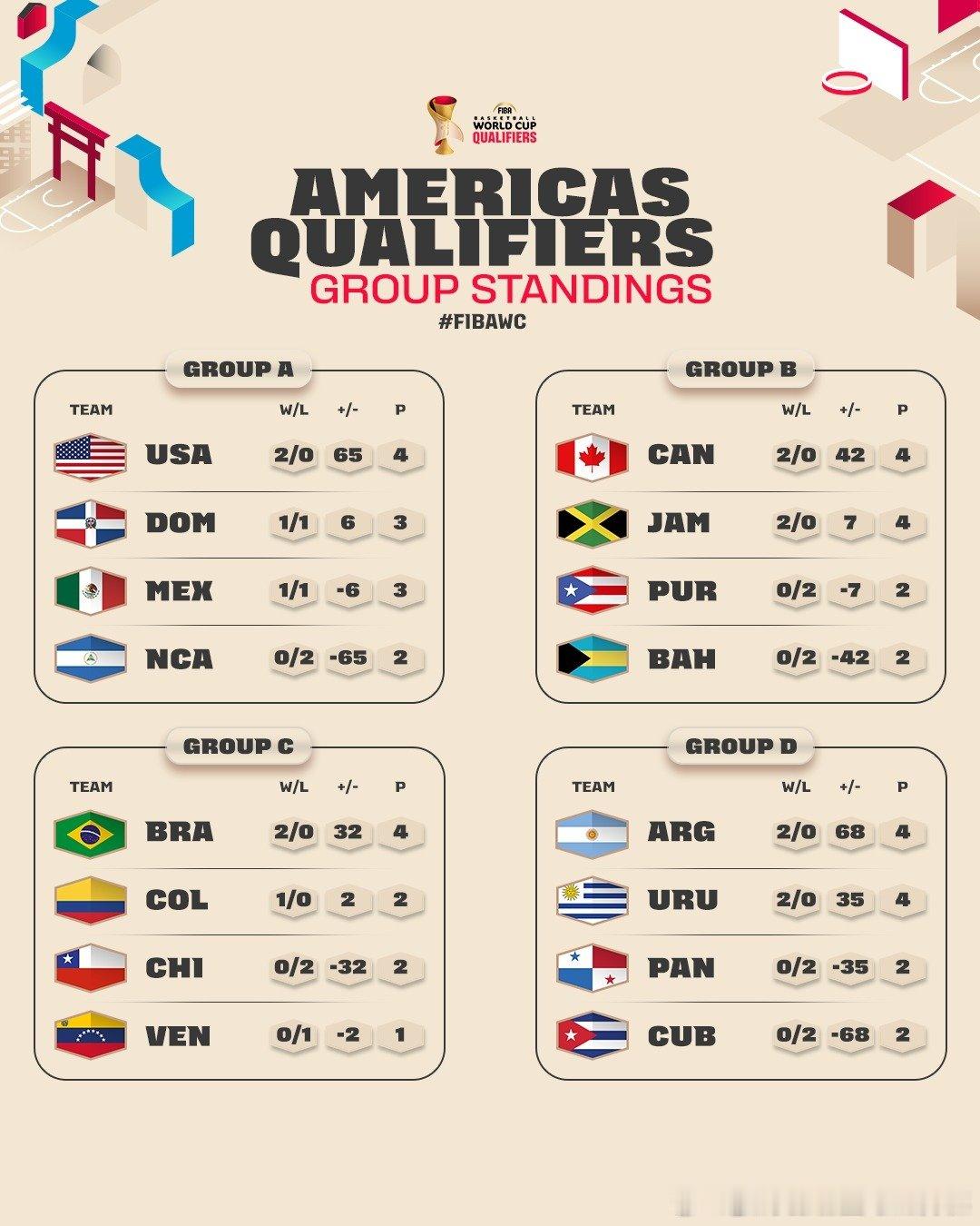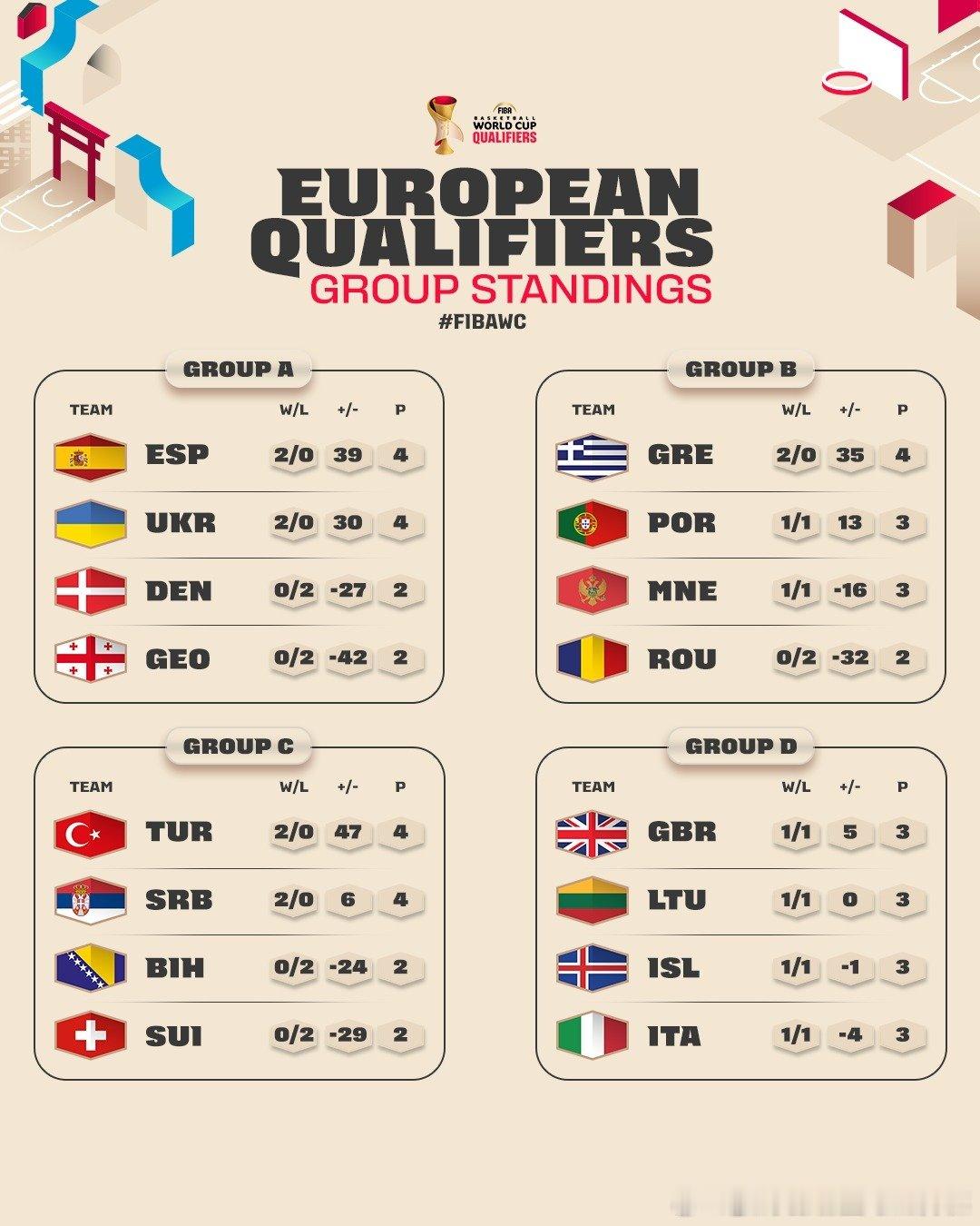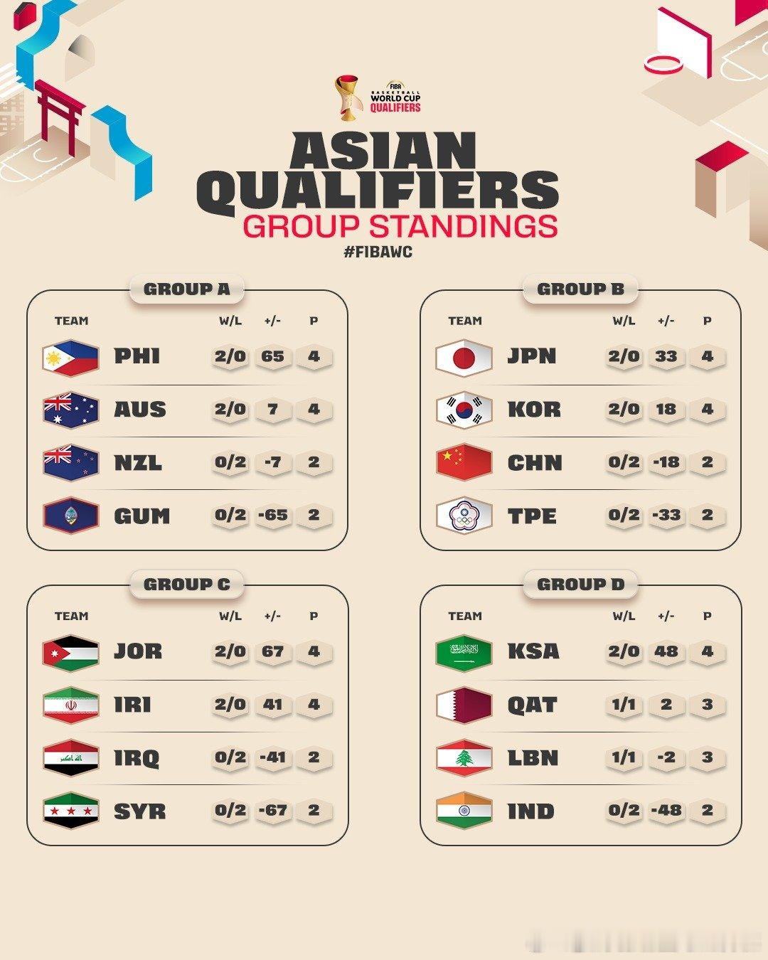 2027 FIBA世界杯 预选赛第一窗口期结束, 四大赛区积分榜👇1️⃣👉非