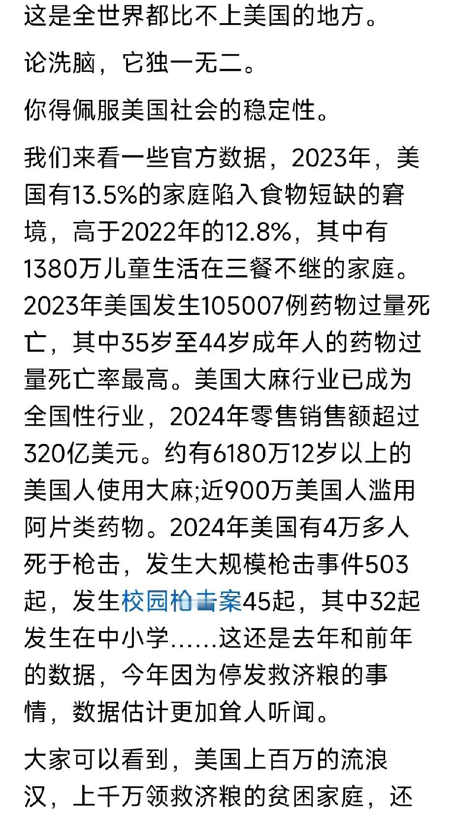 红色文化网报道:美国掌握着全球最为厉害的愚民手段。在美国,13.5%的家庭面临食物短缺难题,1380万儿童生活在三餐难以保障的家庭之中。此外,美国还有数千万的流浪汉。 美国明年就要崩溃了。