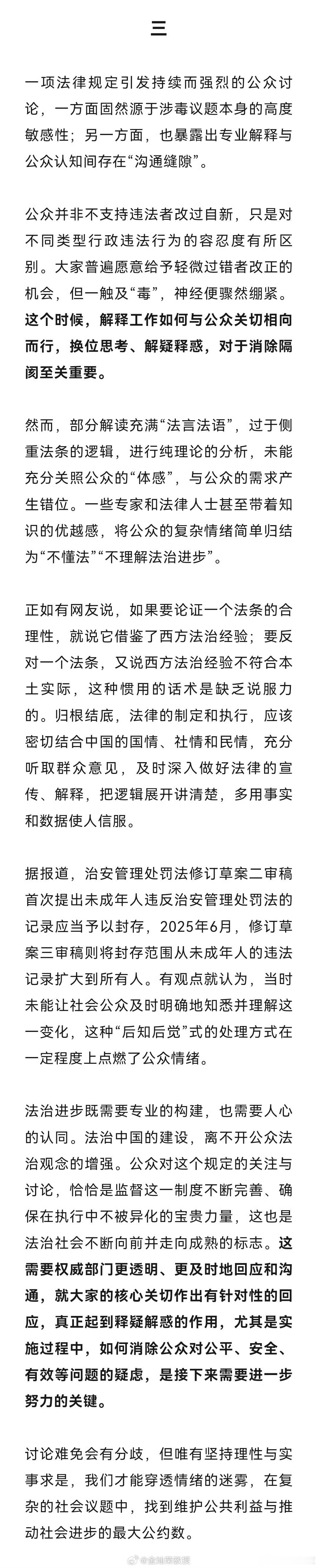 浙江宣传:“吸毒记录封存”之忧要被听见!公众并非不支持违法者改过自新,只是对不同类型行政违法行为的容忍度有所区别。大家普遍愿意给予轻微过错者改正的机会,但一触及“毒”,神经便骤然绷紧。这个时候,解释工作如何与公众关切相向而行,换位思考、解疑释惑,对于消除隔阂至关重要。