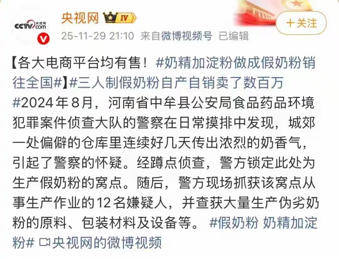 央媒曝光:14种品牌奶粉,都是假的!原料为奶精+淀粉,已销往全国 看到这条新闻时,我气得拍了桌子——这哪是造假,分明是拿人的健康当儿戏,尤其是奶粉的主要受众是孩子和老人,这群黑心商家简直是丧尽天良!作为常年关注社会热点和民生事件的历史博主,我见过不少投机取巧的骗局,但用奶精和淀粉勾兑假奶粉,堂而皇之销往全国,涉案金额高达数百万,这种胆大包天的操作,还是让我脊背发凉。更让人揪心的是,这些假奶粉做得真假难辨,连普通人甚至专业人士都容易上当,背后藏着的产业链,藏着太多让人细思极恐的细节。 这起假奶粉案的曝光,源于一股异常的奶香味。2024年8月,河南中牟县的民警在日常摸排时,发现城郊一处偏僻仓库里,连续几天飘出浓烈的奶香,这股香味浓得不正常,不像是正规食品厂的味道,反而带着一股工业香精的刺鼻感。出于职业敏感,民警们在仓库对面的二楼蹲守观察,透过百叶窗看到的景象,让他们瞬间提高了警惕:十多个工人从早到晚忙个不停,生产、包装、打包一气呵成,每天下午都会有物流货车来拉货,外包装上印着的都是某国外品牌的奶制品标识。 顺着物流单据追查,民警们更是倒吸一口凉气:这些所谓的“进口奶粉”,竟然在各大电商平台和视频号上全面铺货,销售范围覆盖了全国各个省份,不知不觉间,已经有无数家庭可能踩了坑。2024年8月20日,趁着货车装满货物准备出发的时机,警方果断展开行动,冲进仓库的那一刻,在场的民警都惊呆了——这里哪里是什么食品生产车间,分明是个脏乱差的黑作坊,奶粉原料、成品和包装材料堆得乱七八糟,地面满是污渍,三个大澡盆当成搅拌容器,原料混合后直接过秤密封,卫生条件差到令人发指。 现场抓获了12名正在作业的嫌疑人,查获的6000余箱成品假奶粉,以及大量原料和设备,揭开了这个骗局的真面目。所谓的“进口牛奶粉、山羊奶粉、骆驼奶粉”等14个品牌,全都是用植脂末(也就是俗称的奶精)、麦芽糊精(淀粉类原料)和固体饮料勾兑而成,添加工业香精伪造出浓郁的奶香味,再配上仿冒的进口包装,就摇身一变成了“营养丰富”的高端奶粉。更离谱的是,这些假奶粉的单罐成本只有2到4元,在电商平台上却卖到30到88元,利润率超过10倍,简直是一本万利的黑心买卖。 最可怕的是,这些假奶粉几乎没有任何营养成分。经专业机构检测,它们的蛋白质、脂肪、钙等关键营养含量都远低于国家标准,甚至几乎为零,说白了就是一堆碳水化合物加工业添加剂。对于正在长身体的婴幼儿来说,长期喝这种假奶粉,不仅会导致发育迟缓、免疫力低下,还会因为淀粉难以消化引发腹胀、腹泻,工业添加剂和奶精里的反式脂肪酸,更是会加重肝肾负担,埋下心脑血管疾病的隐患;而对于需要补充营养的老年人来说,喝这种假奶粉无异于“吃安慰剂”,根本达不到营养补给的效果,反而可能损害健康。 隔壁邻居张阿姨的孙子,前段时间就因为喝了这种假奶粉,连续几天腹泻不止,小脸瘦了一圈,急得张阿姨团团转,直到医生排查出奶粉问题,她才知道自己花高价买的“进口奶粉”竟是假货。像张阿姨这样的受害者不在少数,很多老年人因为信息闭塞、贪图便宜,很容易被商家“天然营养”“物美价廉”的宣传忽悠;而年轻父母们忙着工作,有时也会忽略奶粉的来源,一不小心就踩了坑。这些黑心商家正是抓住了消费者的心理,在网上大肆夸大宣传,把毫无营养的假奶粉包装成养生佳品,赚着昧良心的钱。 好在正义不会缺席,经过缜密侦查和司法审理,2025年7月10日,中牟县人民法院对三名主犯作出判决,以生产、销售伪劣产品罪判处三人有期徒刑十五年并处罚金,其余十余名涉案嫌疑人也已移交检察机关提起公诉,涉案的650余万元赃款也被依法追缴。这个结果大快人心,但我们更该反思,为什么这样的黑作坊能存在这么久,能把假奶粉销往全国?说到底,还是线上平台的监管存在漏洞,让黑心商家有了可乘之机。 作为普通人,我们没法改变大环境,但可以提高警惕,避免踩坑:买奶粉尽量选择正规渠道和知名品牌,不要轻信网上的低价“进口货”;冲调时如果发现奶粉溶解过快、口感过于香浓,或者孩子、老人喝了出现不适,一定要及时停止食用并举报。食品安全无小事,每一次对假货的纵容,都是对黑心商家的纵容,只有我们共同擦亮眼睛,才能让这些害人的假货无处遁形。 你身边有人遇到过假奶粉骗局吗?关于如何辨别假奶粉,你有哪些实用技巧?欢迎在评论区分享,帮更多人避坑!