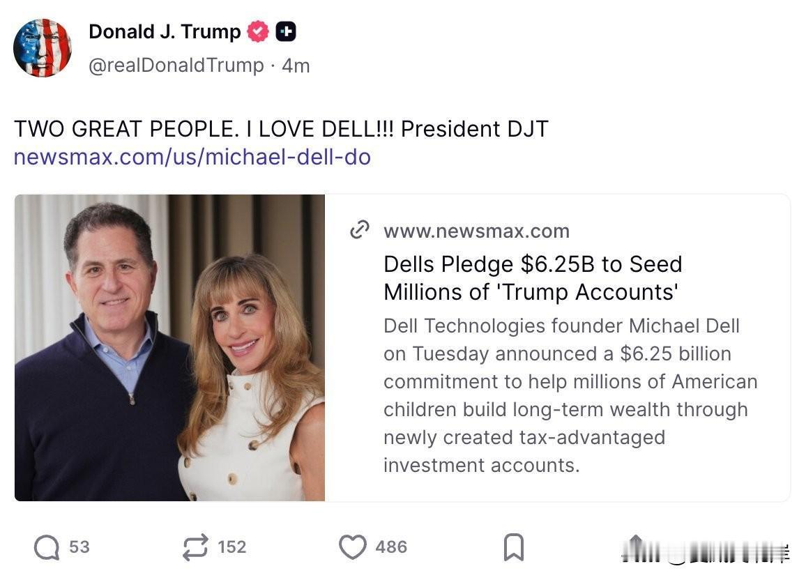 在Dell夫妇宣布向“川普账户”捐赠62.5亿美元后,川普发文大赞两人是了不起的人物。 “两位了不起的人。我爱DELL!!!” “川普账户”源于其团队对“缩小贫富差距”的竞选承诺,旨在通过税收优惠鼓励低收入家庭为新生儿进行长期投资,账户资金可用于教育、购房或退休,类似升级版的“儿童储蓄账户”(CSA)。